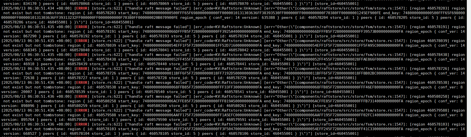 [2025/08/14 06:20:29.647 +08:00] [INFO] [scheduler.rs:458] [“get snapshot failed”] [err=“Error(Request(message: "peer is not leader for region 219075885, leader may None" not_leader { region_id: 219075885 }))”] [cid=29284436]