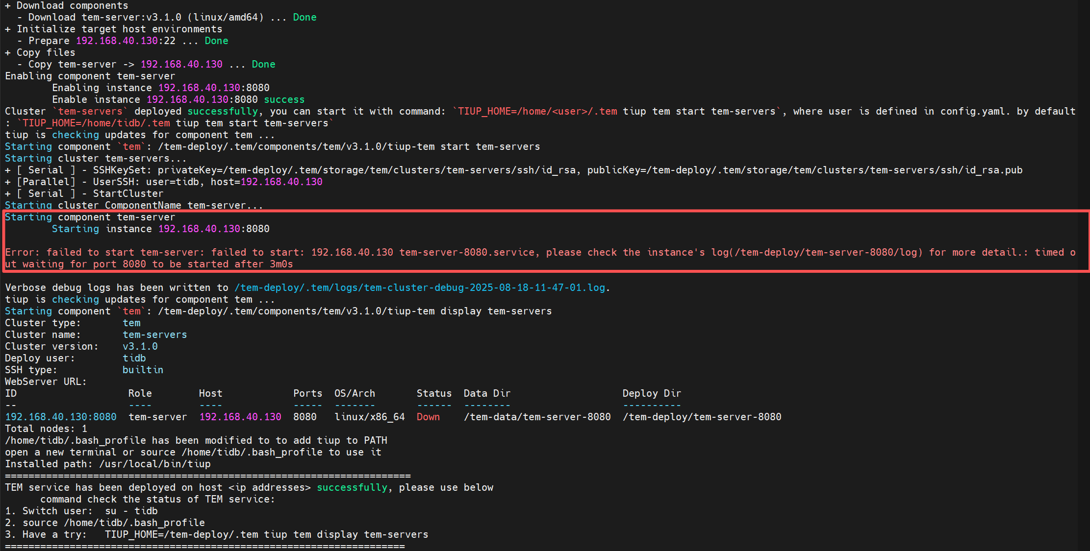 【TiDB 使用环境】测试 【TiDB 版本】 【操作系统】Rocky Linux release 8.10 (Green Obsidian) 【问题复现路径】TEM安装报错 【遇到的问题:问题现象及影响】