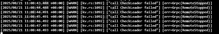 4、tikv-03 的 log 中出现大量的 [WARN] [kv.rs:1092] [“call CheckLeader failed”] [err=Grpc(RemotStopped)] 的告警