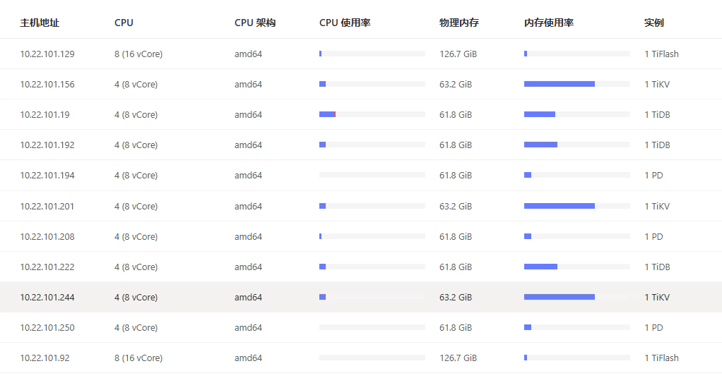 【资源配置】进入到 TiDB Dashboard -集群信息 (Cluster Info) -主机(Hosts) 截图此页面