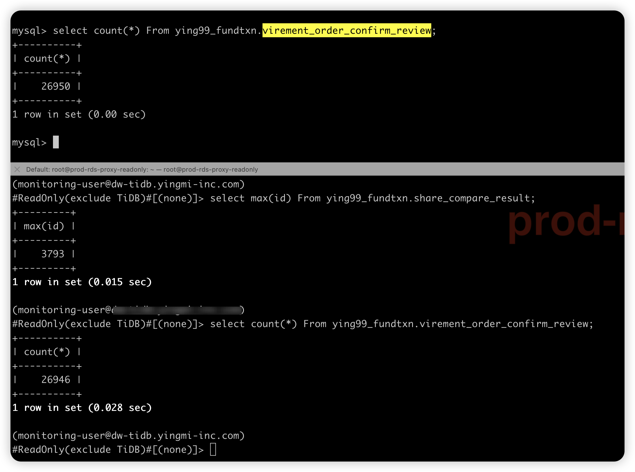 - 上下游数据不一致,表现是个别表复制停滞,如图是 count() 对不上