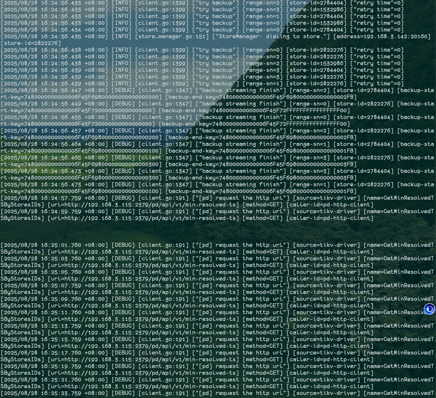 [2025/08/28 12:16:47.383 +08:00] [DEBUG] [client.go:191] ["[pd] request the http url"] [source=tikv-driver] [name=GetMinResolvedTSByStoresIDs] [url="http://192.168.3.115:2379/pd/api/v1/min-resolved-ts?scope=1532986,2784404,2822276"] [method=GET] [caller-id=pd-http-client]