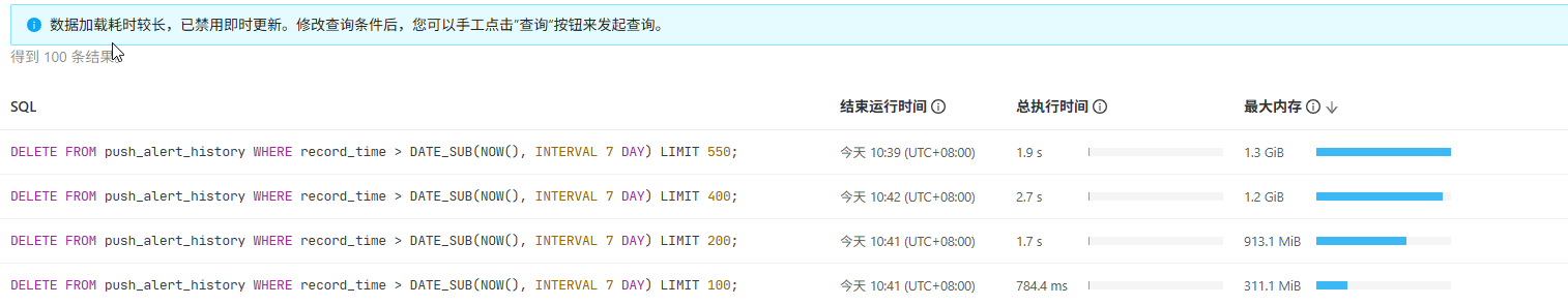 【遇到的问题:问题现象及影响】go服务中有一个定时任务,会在每天凌晨执行删除过期数据的操作,SQL如下:DELETE FROM push_alert_history WHERE record_time < DATE_SUB(now(),INTERVAL 7 DAY) LIMIT 500。但是在客户生产环境运行时报错OOM,客户表中数据约有500W条,但是单条数据不大。