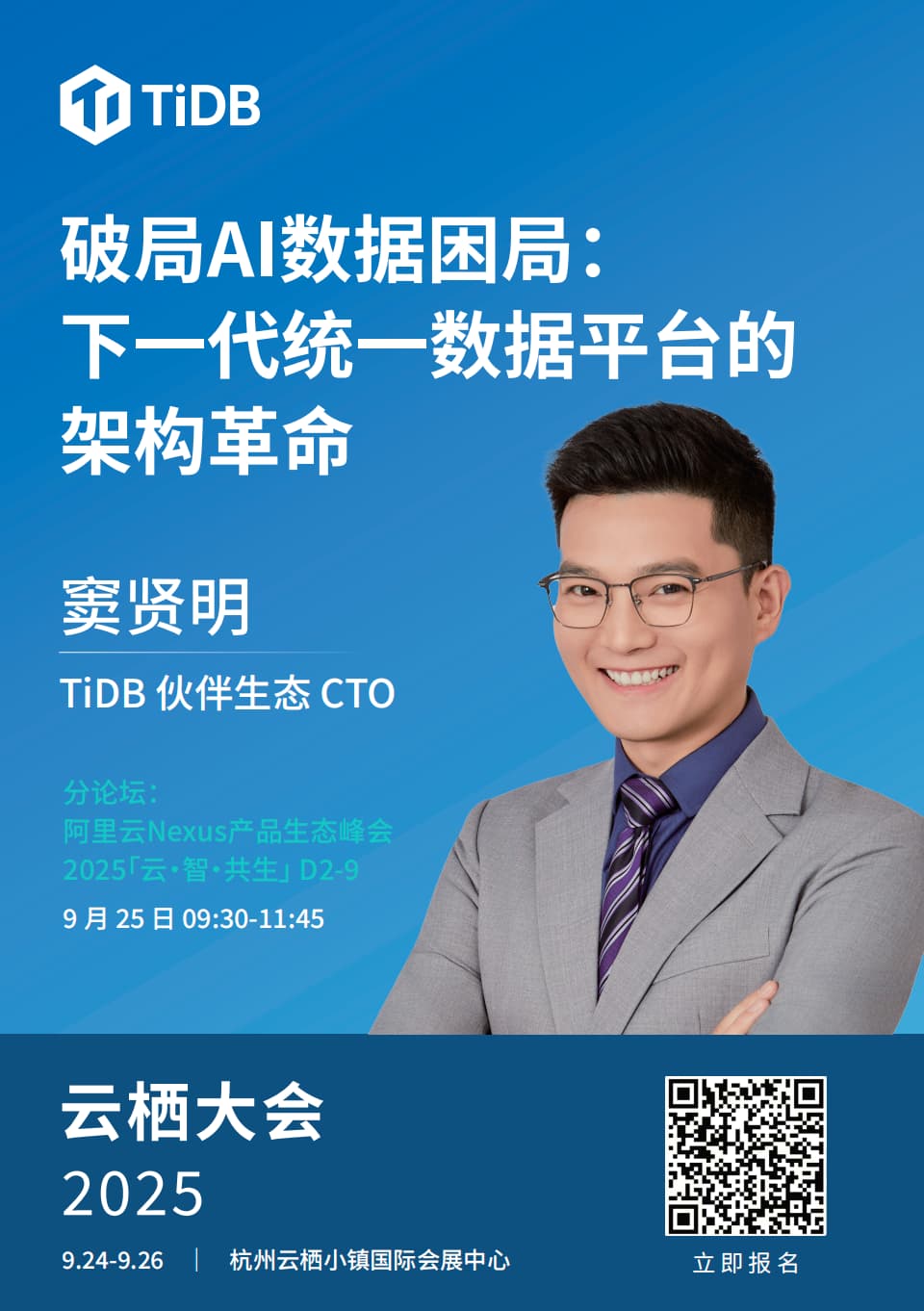 作为 云原生、AI Ready 的分布式 SQL 数据库引擎,TiDB 将亮相「云栖大会·杭州站」,TiDB 与阿里云长期携手,在云原生与 AI 创新生态中不断深化合作:共同推动开放数据库生态建设,探索企业数据智能化的落地场景,助力更多行业实现云上转型与智能升级。在 计算馆 2-9 展位、阿里云 Nexus 产品生态峰会 以及 2 号馆小舞台 与大家共度这场科技盛会,分享下一代统一数据平台的最新实践与 AI 场景落地经验。