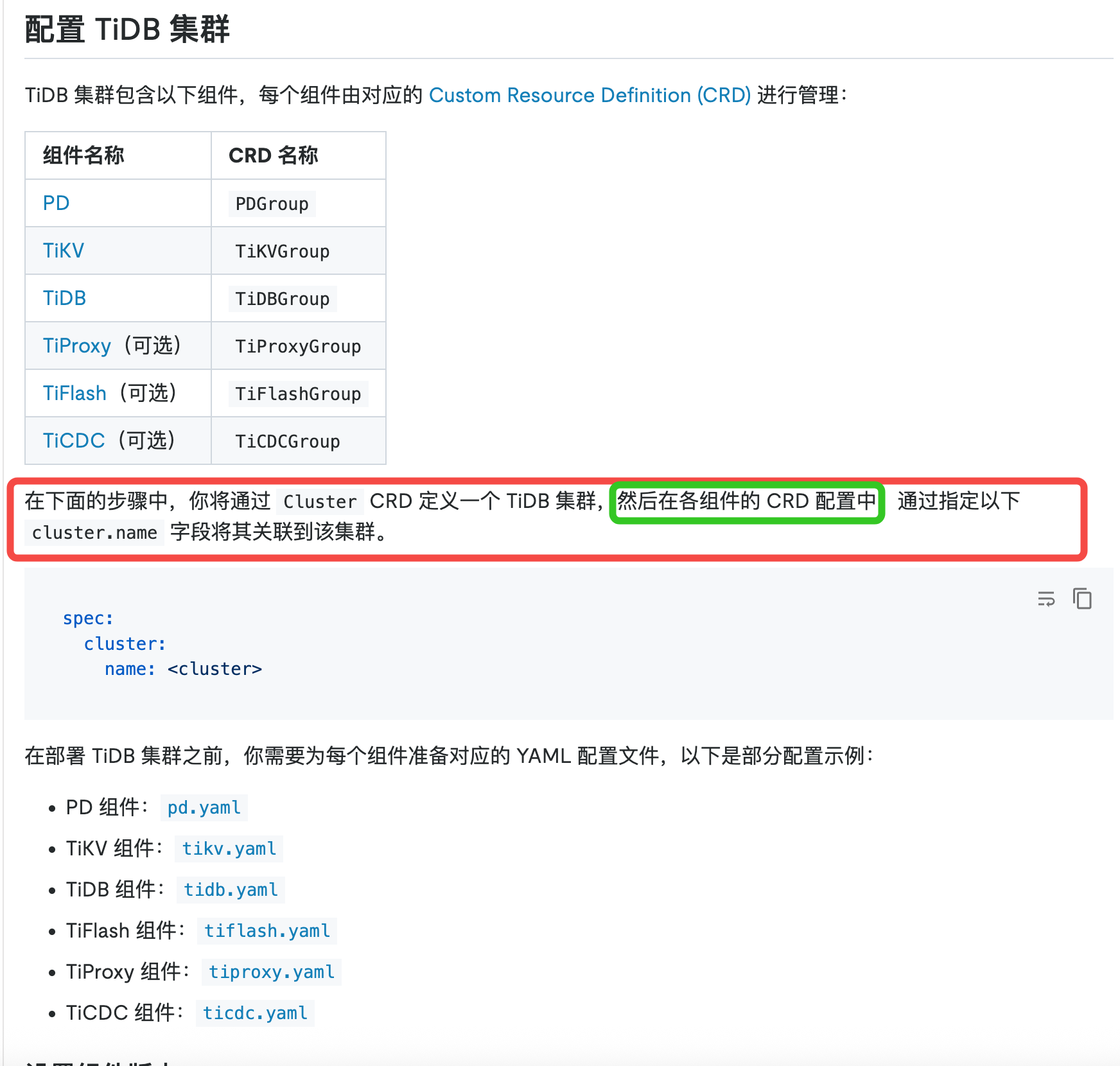 之前 tidb 是一个 tc 搞定,现在分成了一个总的 cr叫: cluster,其他的就是组件的。