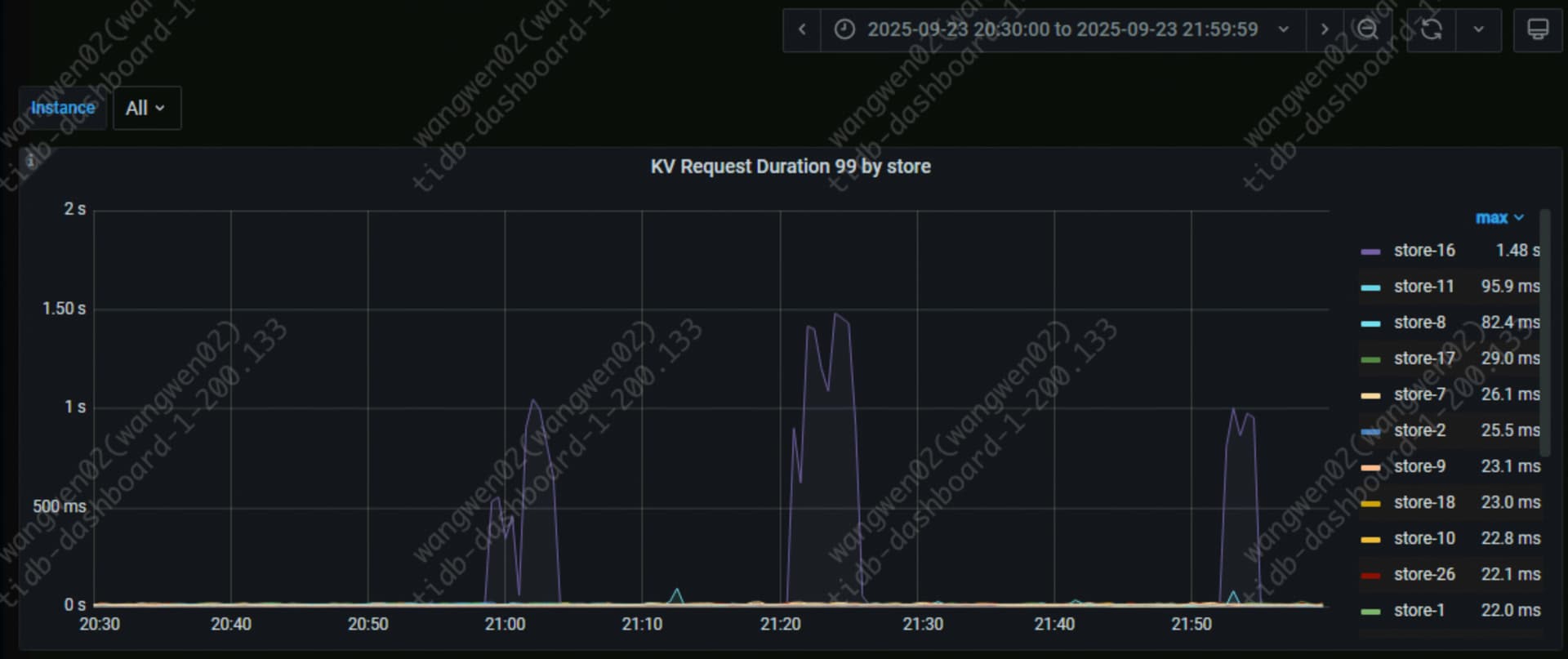 2025-09-23 20:59与2025-09-23 21:09,业务TPS均没有突刺,但集群出现抖动,导致DML语句执行耗时增加,查看监控,发现部分异常。