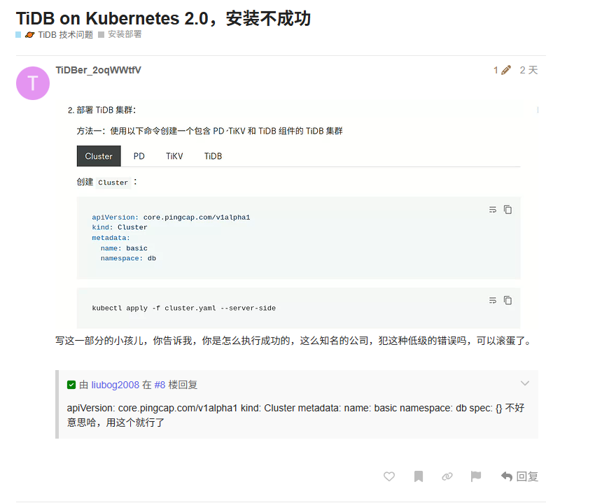 基于上述考量,为避免不当言论进一步毒化社区氛围、打击贡献者积极性,我们依据《TiDB 社区规则及使用指南》中 “保持友善交流,不可人身攻击”“禁止骚扰或造谣” 等条款,对该用户采取 禁言 1 日 的处理,同时保留其技术问题的核心内容以便后续解答。若他日再犯,根据社区规则,将永久封号。