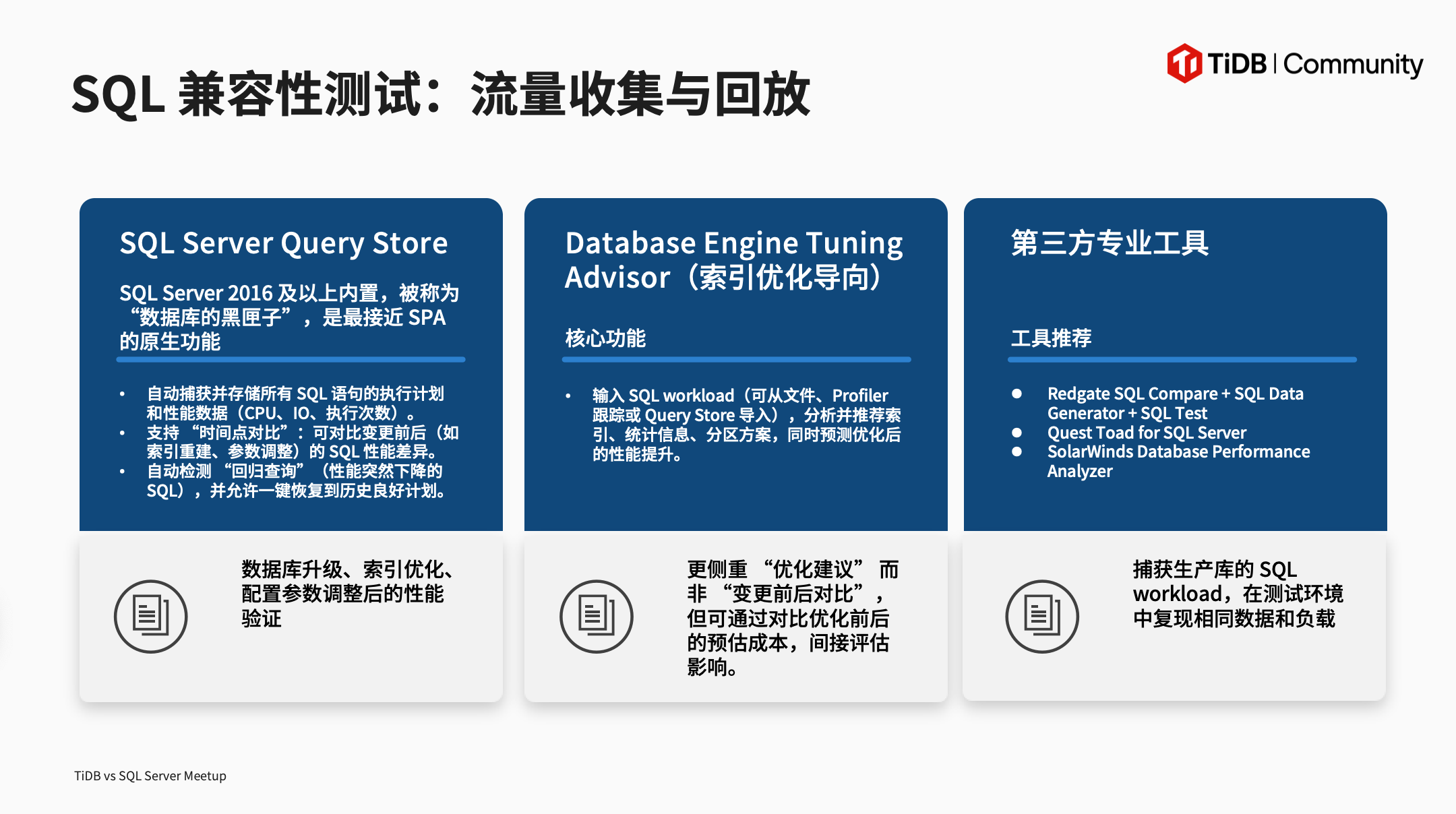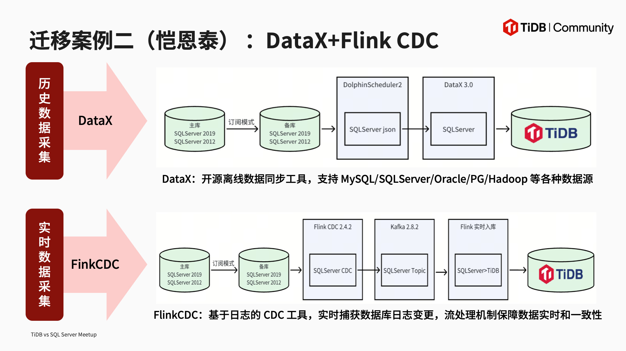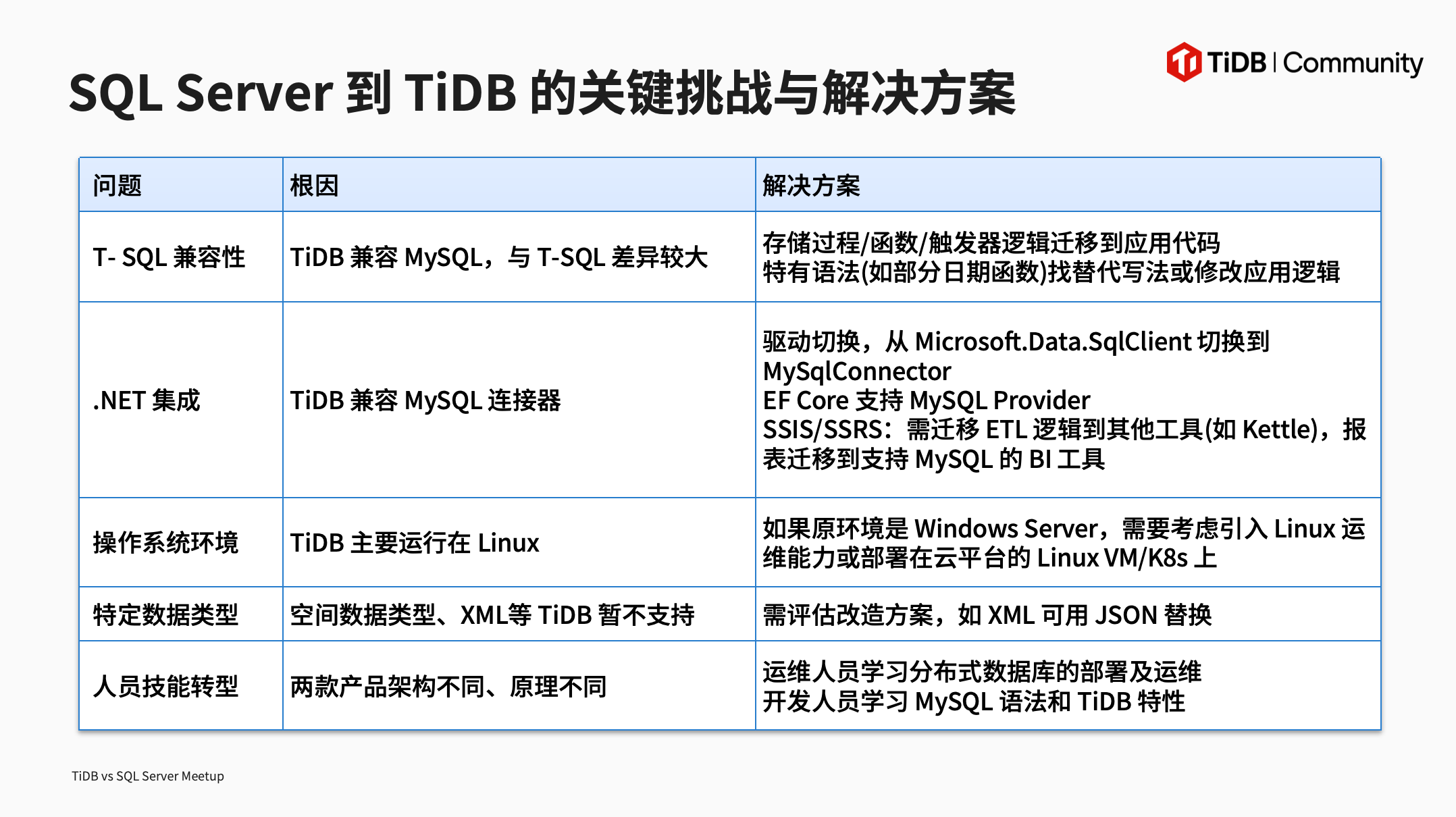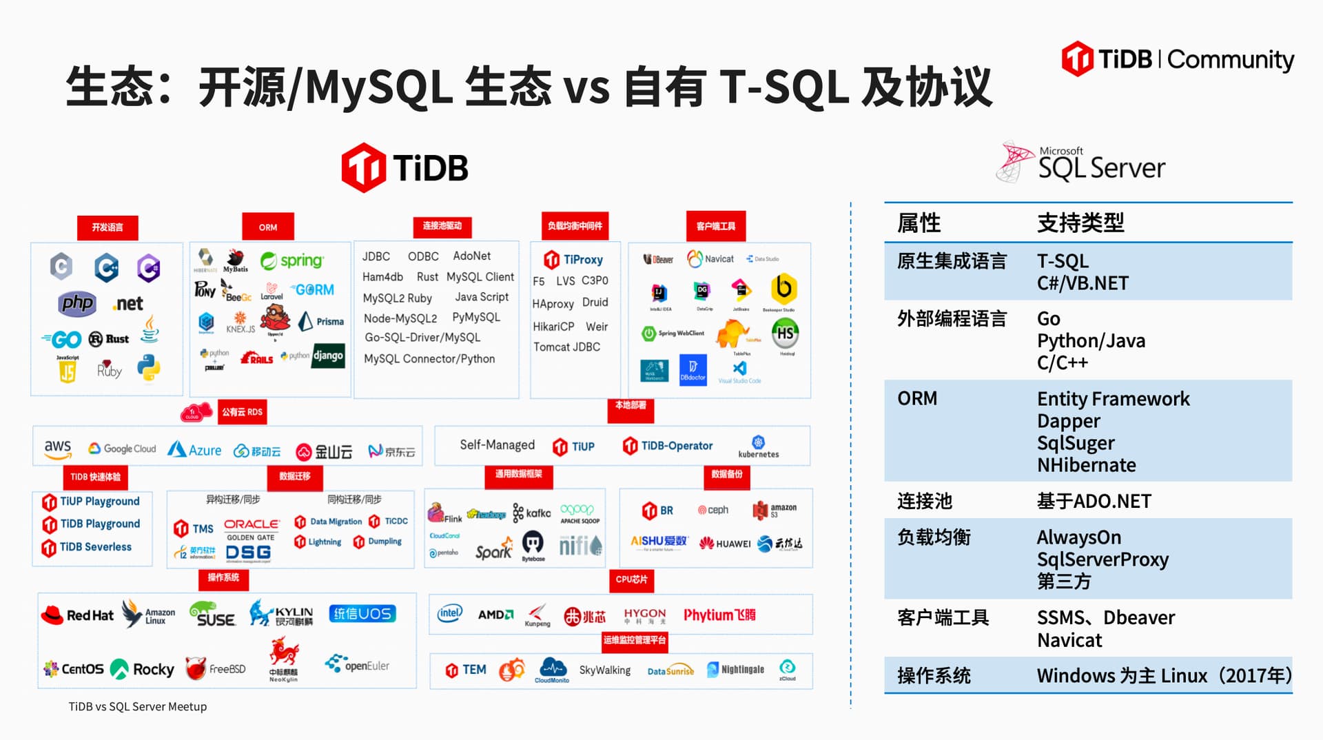 sqlserver 在windows 平台占有一席主导地位,特别是关系数据,目前sqlserver 逐步可以部署linux平台 并且 SQL Anywhere 数据库引擎,确保包括数据类型、操作符、函数、连接、子查询和事务控制在内的核心 SQL 功能在不同环境和场景下都能按照 SQL 标准正确执行。在linux平台移植到TIDB可以有天然优势 。TIDB 承接SQLSERVER业务也是有自己强大能力。特别性能方面。