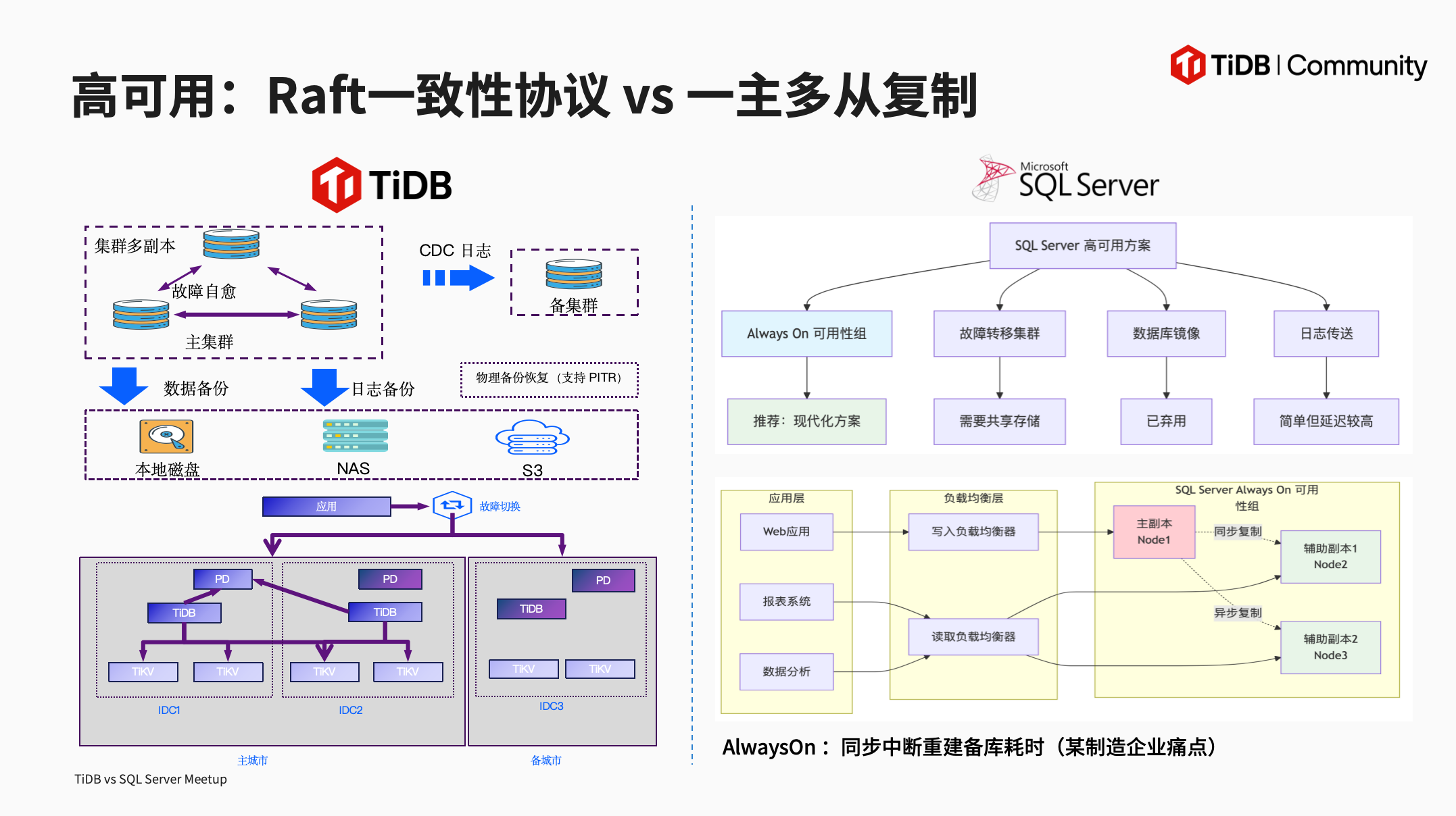 在本次分享中,刘源老师围绕 SQL Server 与 TiDB 展开深度分析,梳理了 SQL Server 的发展历程以及当下 SQL Server 用户面临许可成本高、横向扩展难、强绑定 Windows 生态等痛点问题。接着从架构、扩展性、混合负载、高可用、生态 等多维度对比二者。TiDB 以原生分布式架构实现计算与存储分离,支持水平扩展,原生 HTAP 能力通过 TiFlash 列存节点实现 TP/AP 物理隔离,基于 Raft 协议保障金融级高可用,且具备开源/兼容 MySQL 生态等特点。