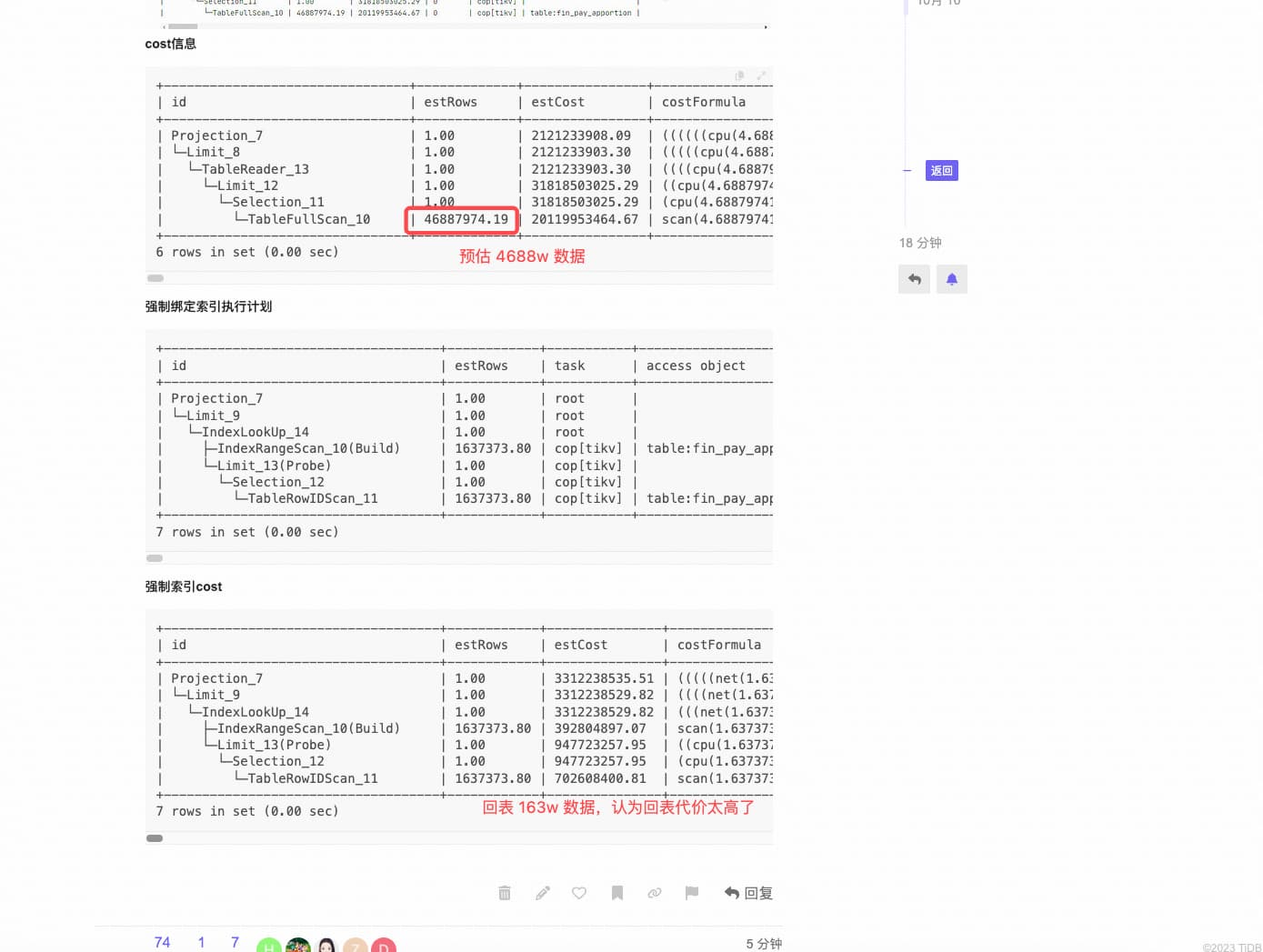 | └─IndexLookUp_14 | 1.00 | 3312238529.82 | (((net(1.6373737951911117e+06*rowsize(35.980000000000004)*tidb_kv_net_factor(3.96))) + (scan(1.6373737951911117e+06*logrowsize(59.480000000000004)*tikv_scan_factor(40.7))))/15.00) + (((((net(1.6373737951911117e+06*rowsize(1130.8249999999998)*tidb_kv_net_factor(3.96))) + (((cpu(1.6373737951911117e+06*filters(3)*tikv_cpu_factor(49.9))) + (scan(1.6373737951911117e+06*logrowsize(1492.1399999999996)*tikv_scan_factor(40.7))))))/15.00) + ((double-read-cpu(1.6373737951911117e+06*tidb_cpu_factor(49.9))) + (doubleRead(tasks(2619.798072305779)*tidb_request_factor(6e+06)))))/5.00) | root | | |