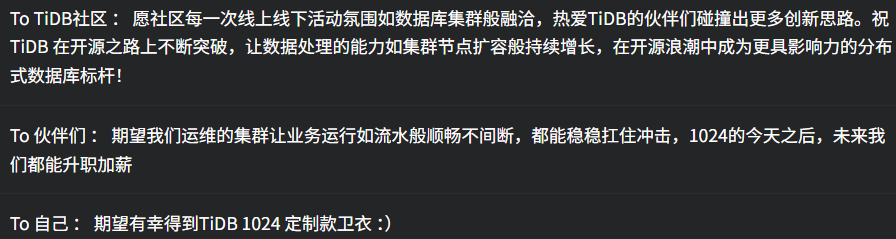 '期望有幸得到TiDB 1024 定制款卫衣 :)' AS wishes