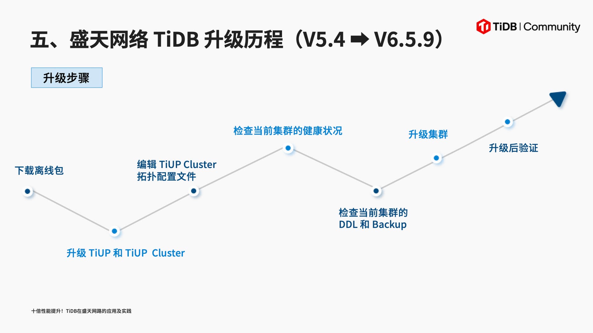 出于业务稳定性、性能及 DBA 视角的架构优化等需求,盛天网络对 TiDB 进行升级,使用收益显著提升。查询耗时提升 10 倍,运维进一步简化、架构得到优化,升级后 DDL 性能大幅提升。最后,嘉宾老师为大家分享了升级需注意的兼容性、测试等事项,并建议数据库选型可优先关注可靠性与稳定性。