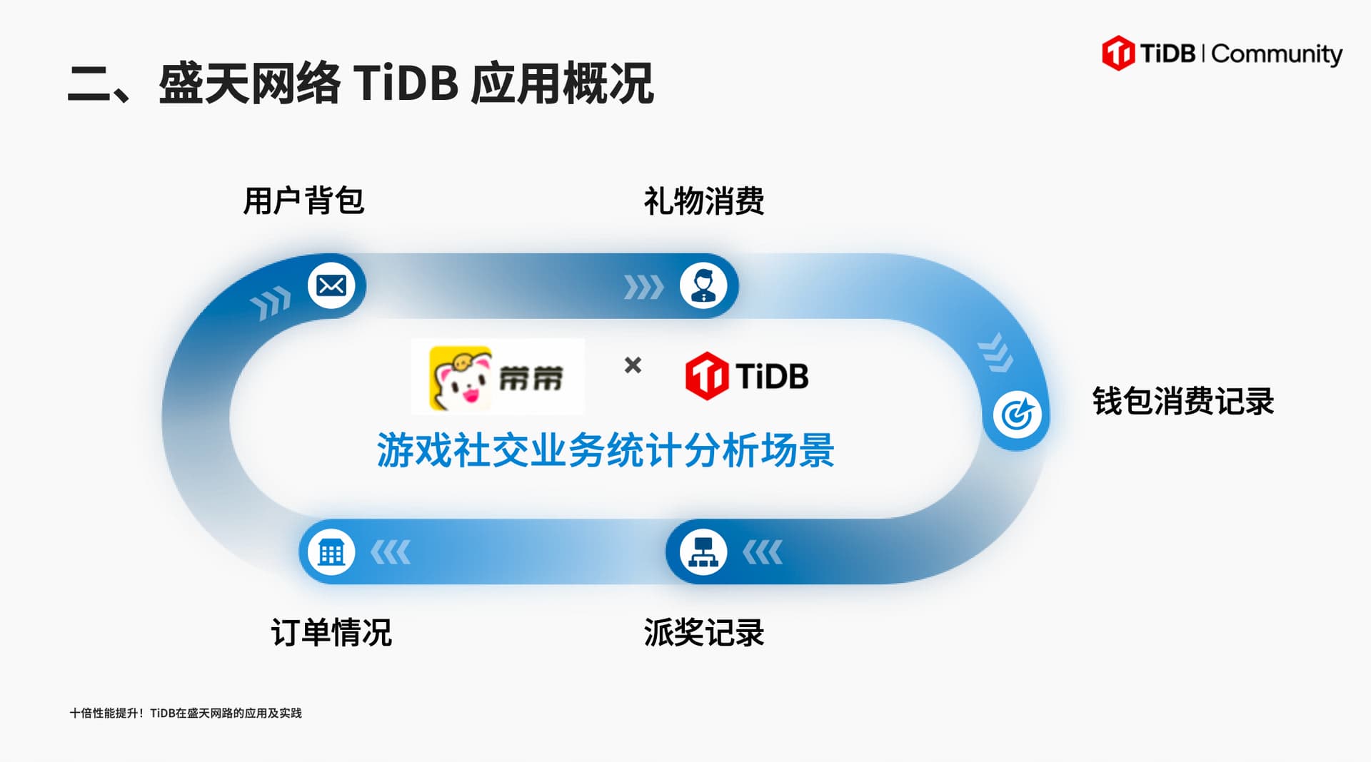 作为国内领先泛娱乐平台,盛天网络主要将 TiDB 应用于游戏社交业务,涵盖用户背包、礼物消费、钱包消费记录、派奖情况、订单情况等统计分析场景。