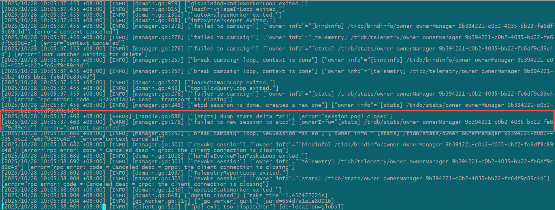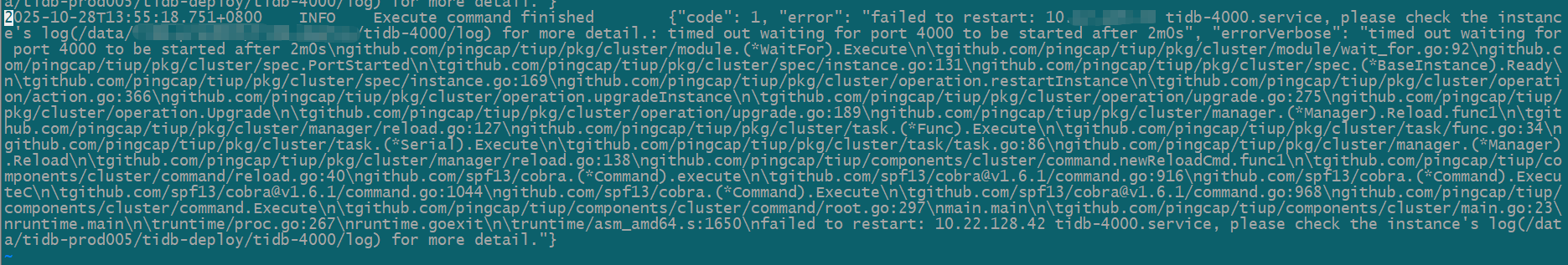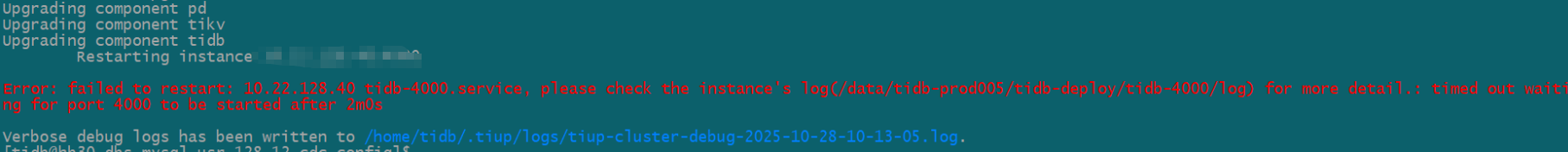升级PD和TiKV都很顺利,但是升级TiDB节点,滚动升级过程中,关闭第一个TiDB节点之后,重启启动超时,具体的报错如下: