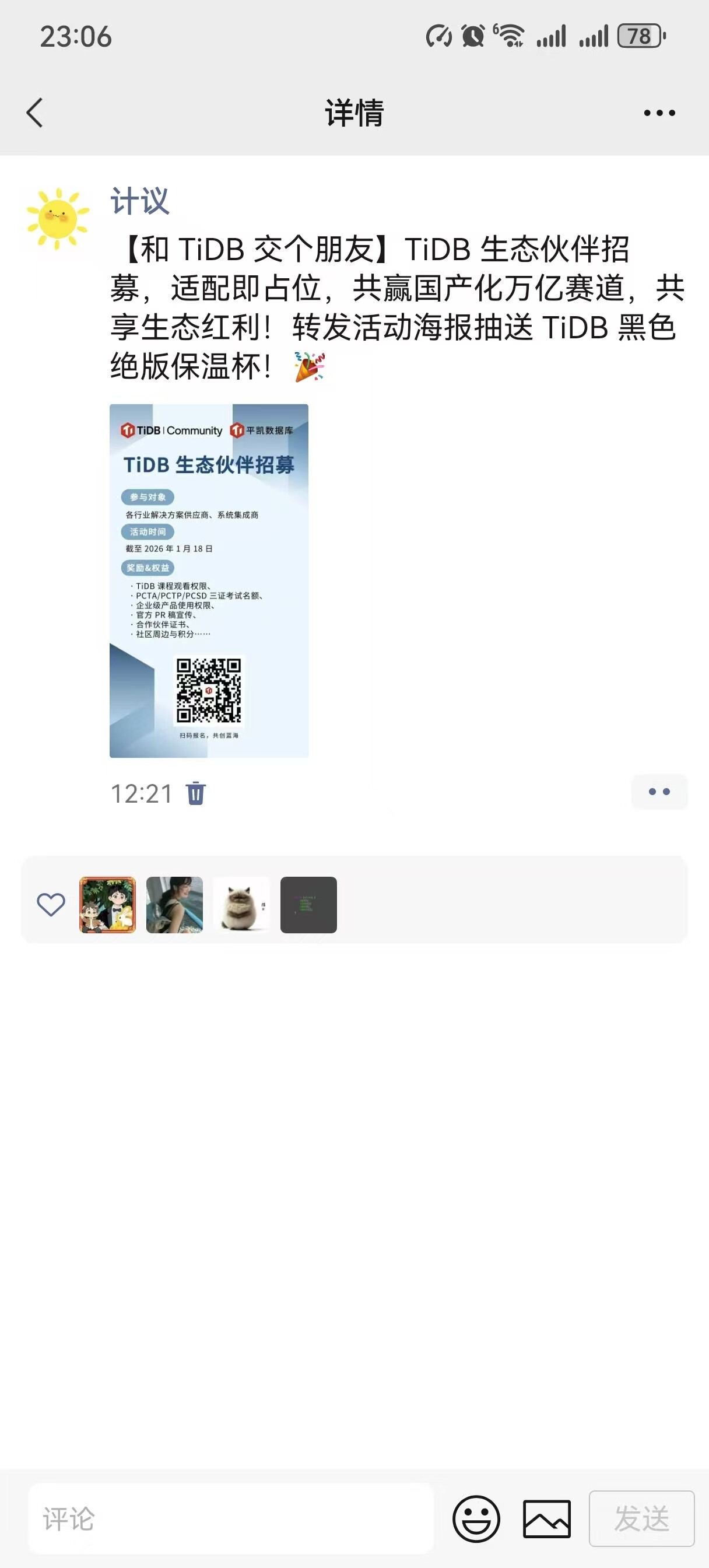 报名进群:https://forms.pingcap.com/f/tidb-partner-event,锁定免费适配名额