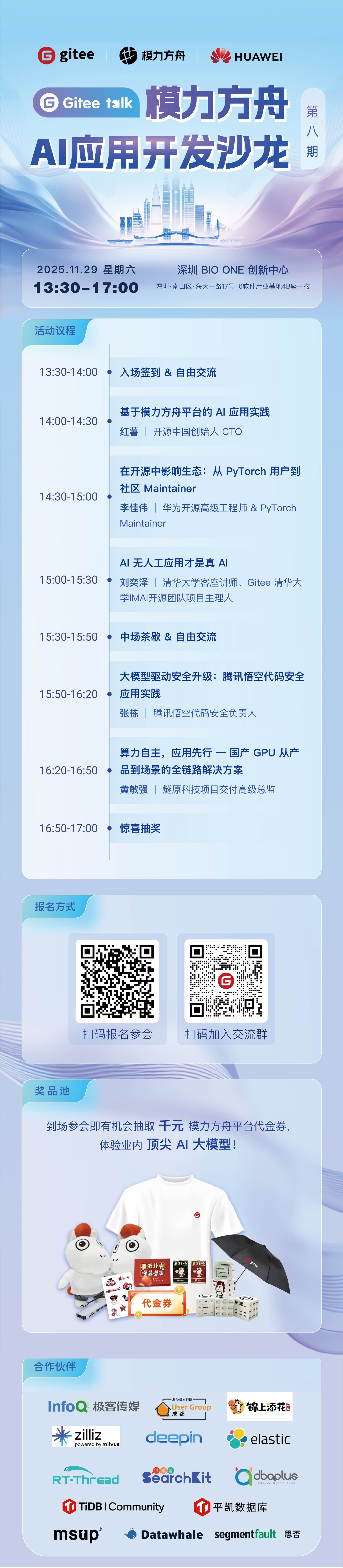 2025年,Gitee Talk 已成功在全国七城举办系列沙龙, 模力方舟 AI 应用开发沙龙 · 第八期将重返深圳,聚焦 “AI × 平台”、“AI × 算力”、“AI × 模型”、“AI × 应用”几大方向,应用开发作者、技术专家、企业代表将现场与开发者共同探讨 AI 技术的最新进展与实战经验, 帮助大湾区开发者看清下一阶段 AI 开发的真正机会。