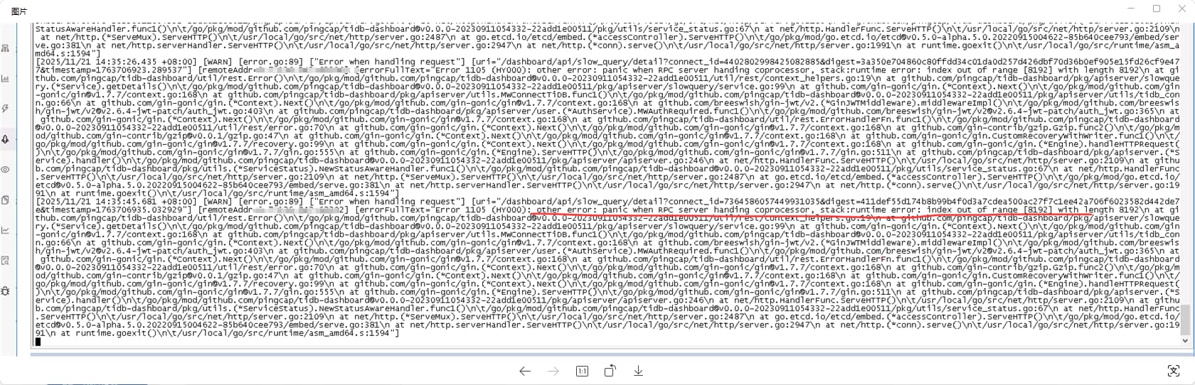 如图提示,dashboard 的”慢SQL“,提示“Eror 1105 (HY000): other error: panic when RPC server handing coprocessor, stackruntime error: index out of range (8192) with length 8192”