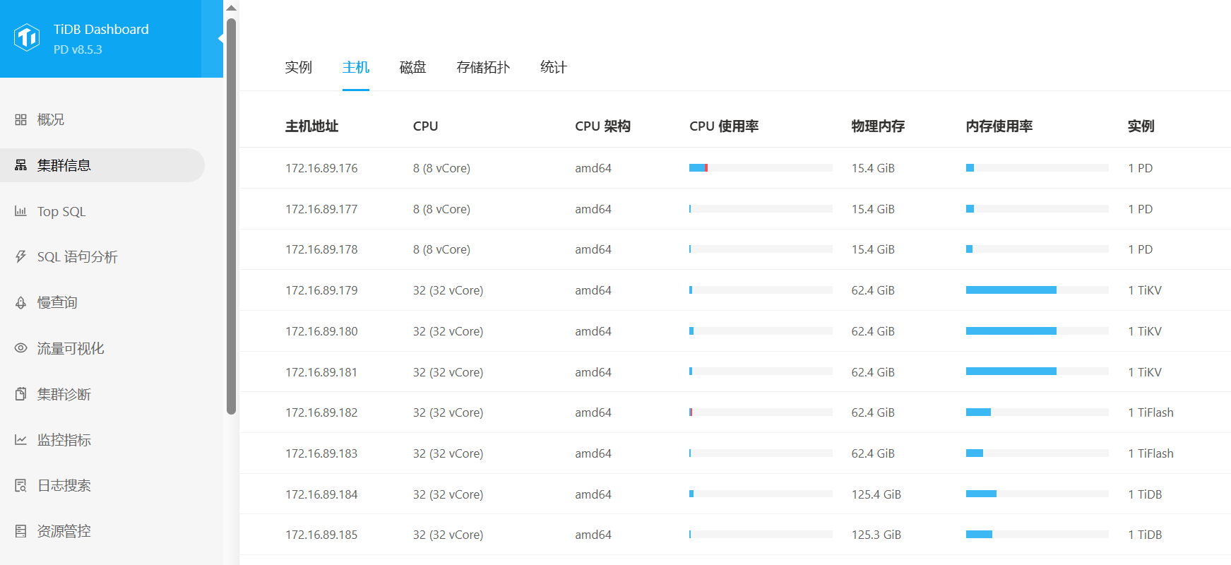 【资源配置】进入到 TiDB Dashboard -集群信息 (Cluster Info) -主机(Hosts) 截图此页面