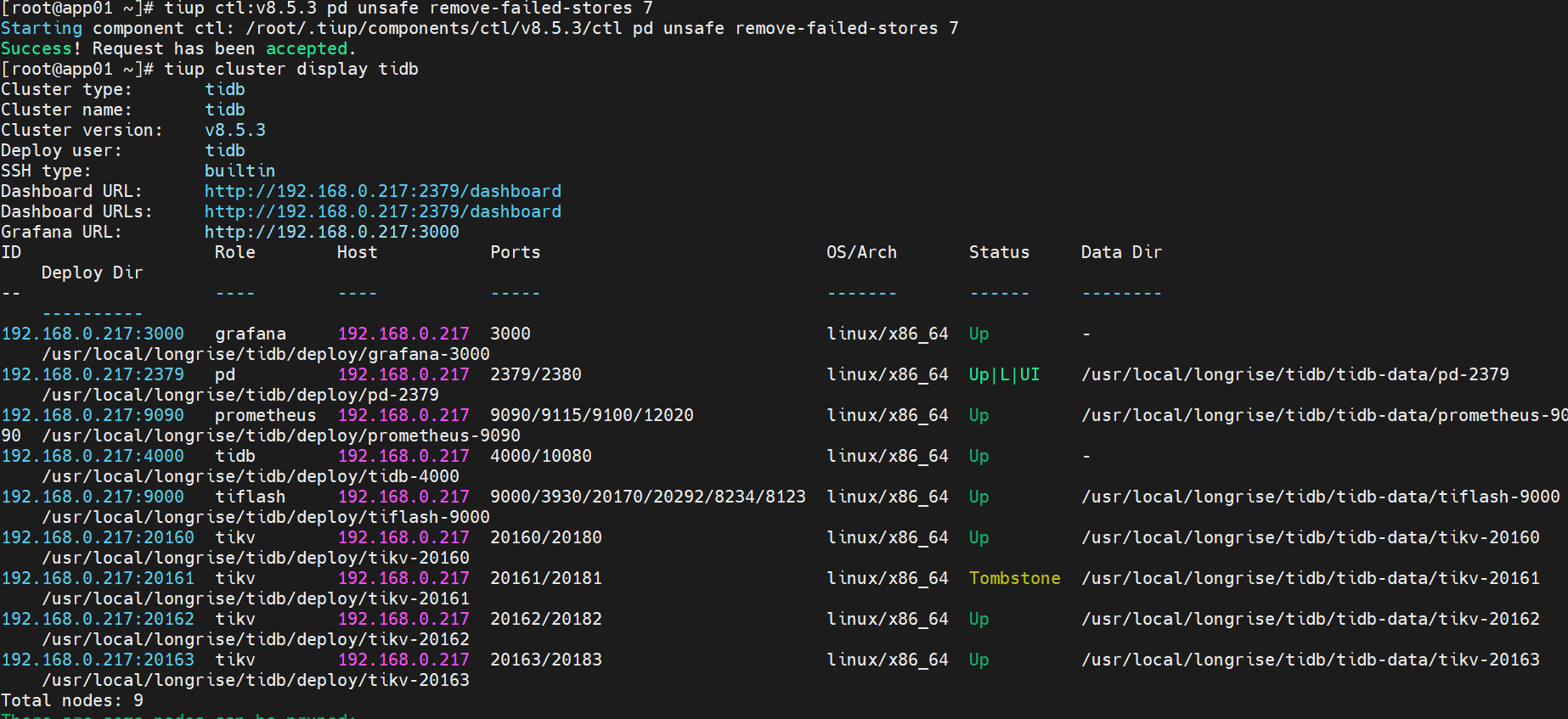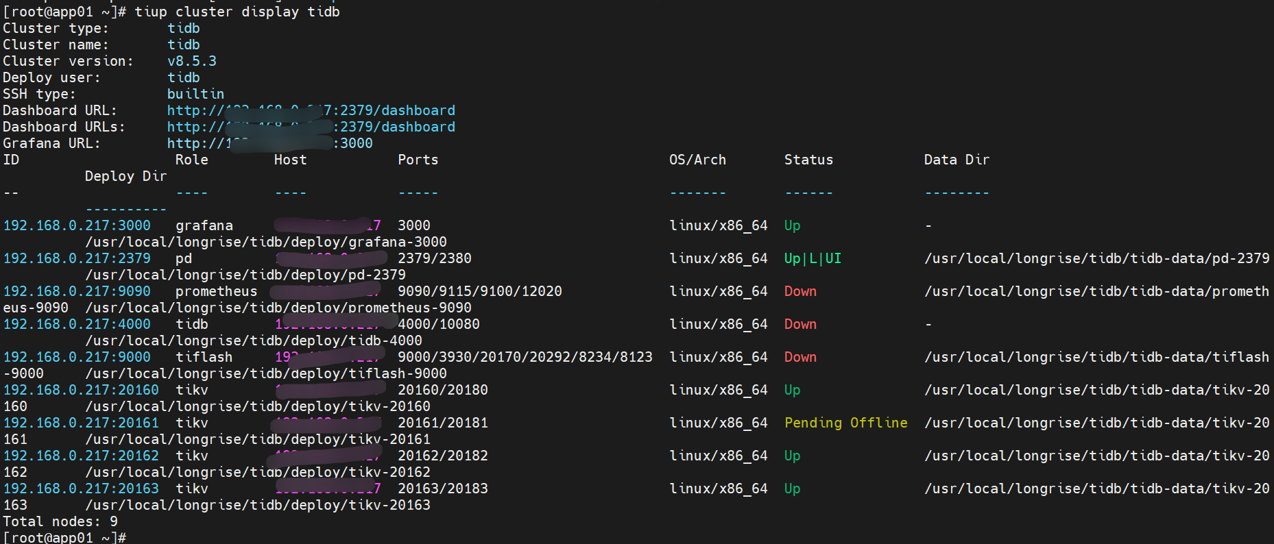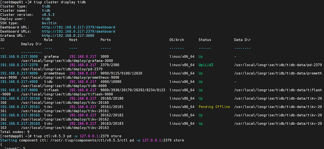 发现tikv节点无法启动,20161一直处于 Pending Offline 状态,并且tidb等其他组件无法启动,强制下线20161后,又新扩容了20163,20163是正常,现在就是想下线20161,以及启动tidb等其他组件。