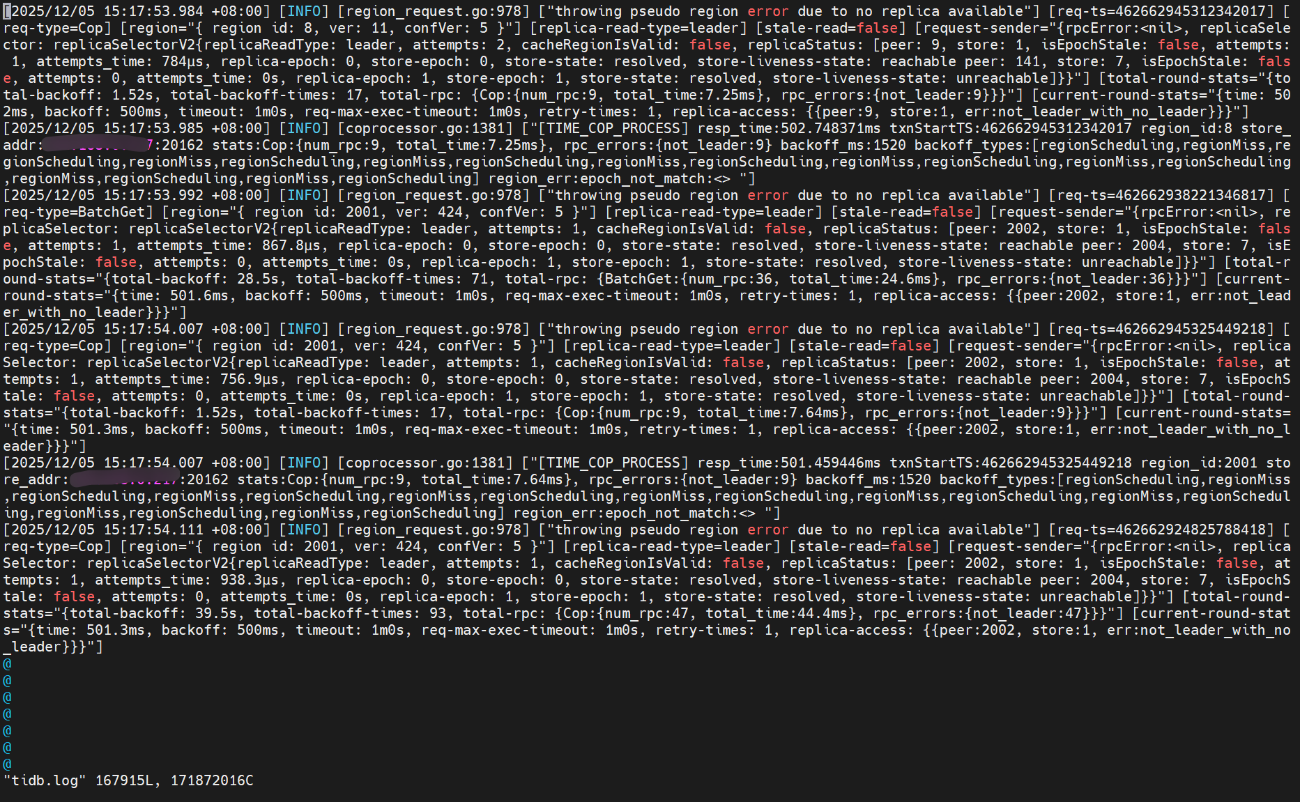 日志中的错误主要表现为“no replica available”和“not leader”,这通常意味着在分布式系统中,某个区域(region)没有可用的副本(replica)或者当前节点不是该区域的领导者(leader)