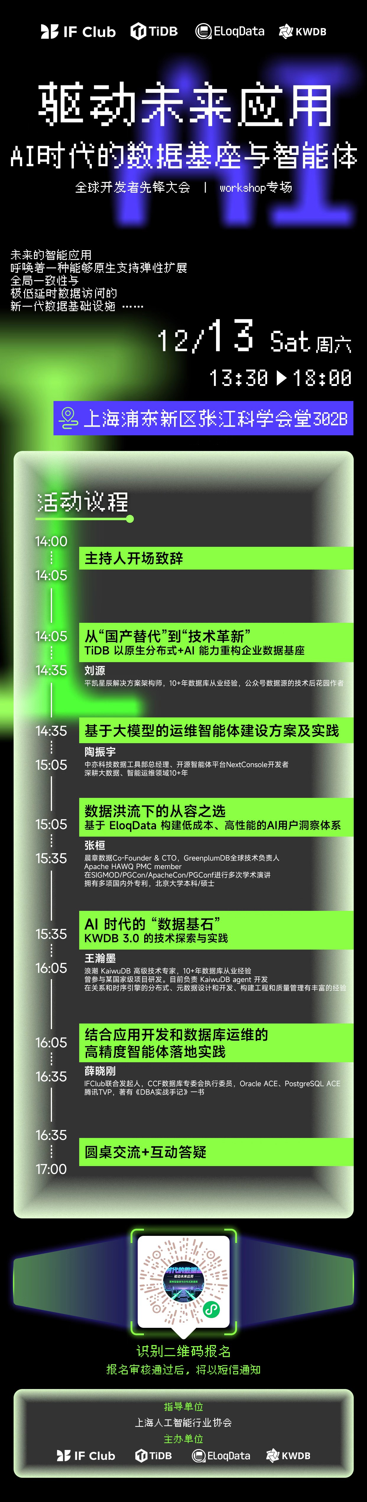 本次 workshop 由上海人工智能行业协会指导,IFClub 社区、TiDB 社区、晨章数据及 KWDB 社区联合主办。活动旨在打破技术瓶颈,探索一种能够原生支持弹性扩展、全局一致性与极低延时访问的新一代数据基础设施。