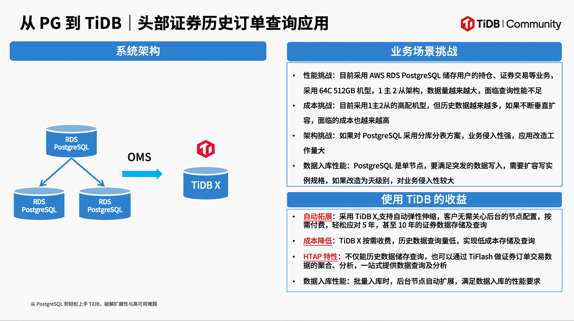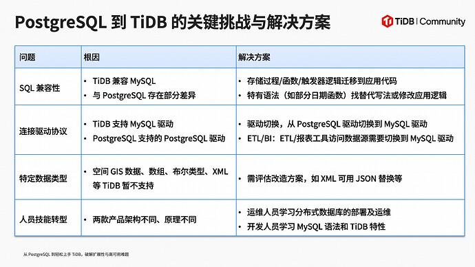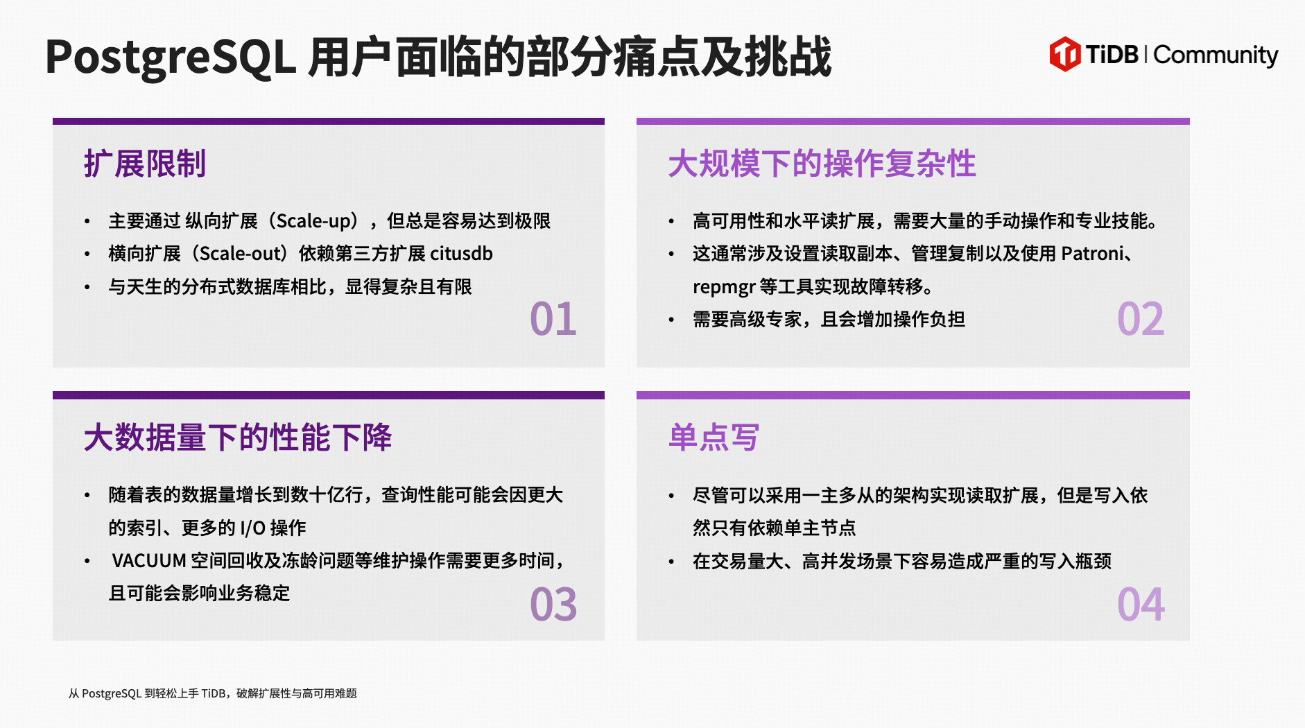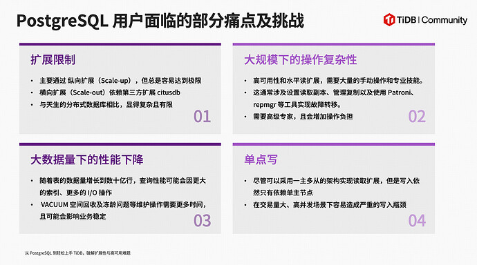 PG 也是非常受欢迎的一款数据库,包括 TiDB 社区里也有很多使用、学习 PG 的小伙伴。在社区调研的过程中也看到大家普遍反馈的一些 PG 的挑战主要集中在性能瓶颈、扩展限制和运维管理,而在这些方面,恰好也是 TiDB 作为一款非常注重使用体验的分布式数据库的优势所在。