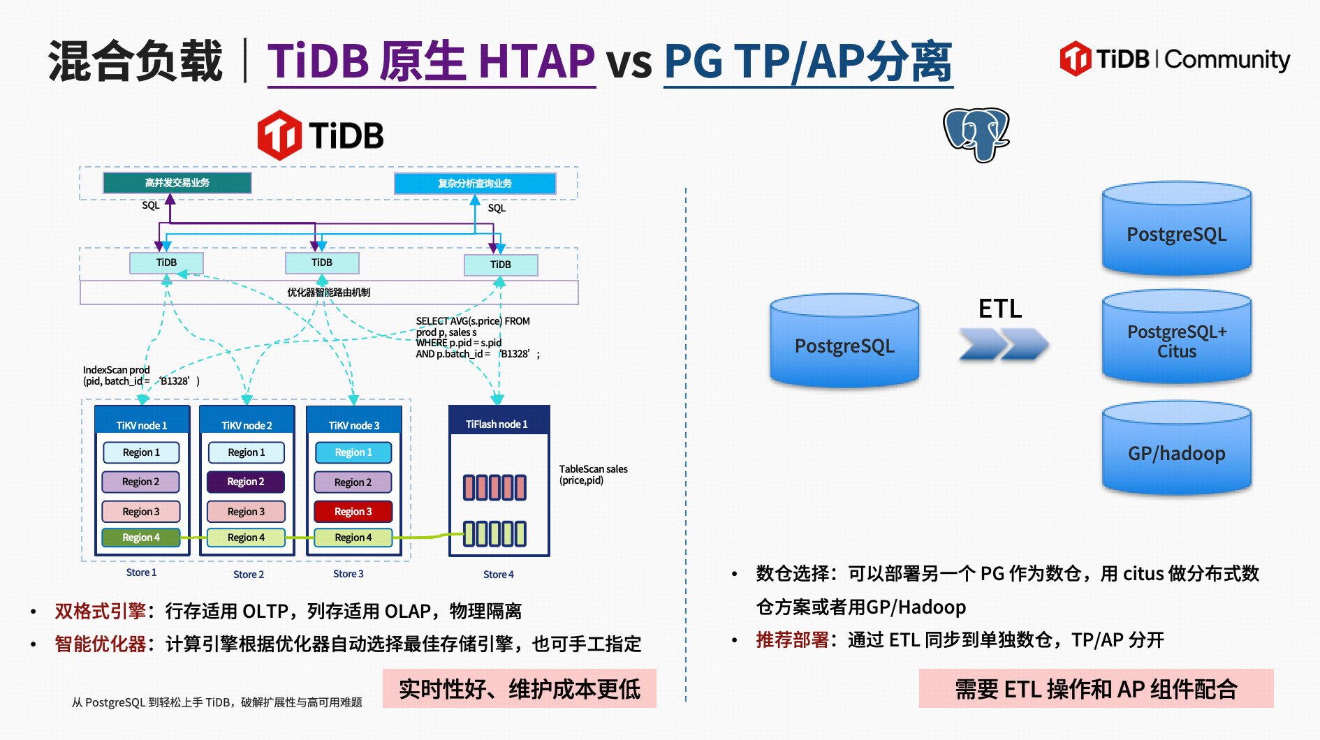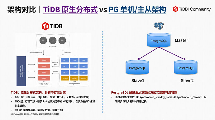 TiDB 以原生分布式架构为核心,针对 PG 痛点提供针对性解决方案,关键优势如下:
