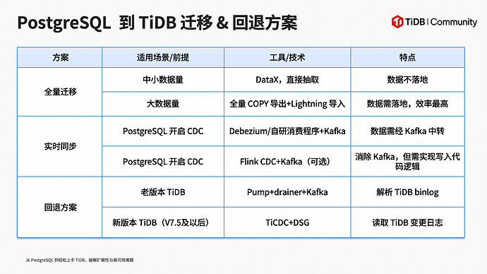 分享明确了 PG 到 TiDB 的成熟迁移体系,核心流程与关键要点如下: