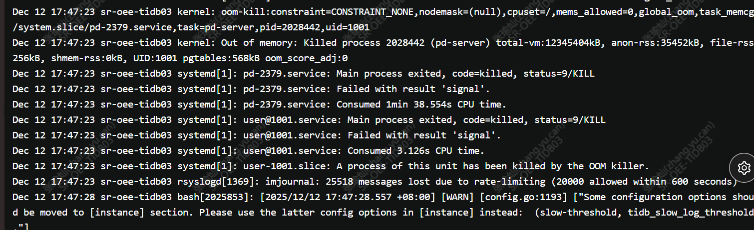整个集群崩了, pd,tidb,tikv,tiflash 先后挂了,且无法重启. 共9台机子,3台tidb和3pd,其中tidb和pd共用两台,其中一台装haproxy负载, 目前试运行阶段,数量和请求都不大. 最大的一个慢查询20秒,约10多万数量,查询很快,发送占用大部分时间