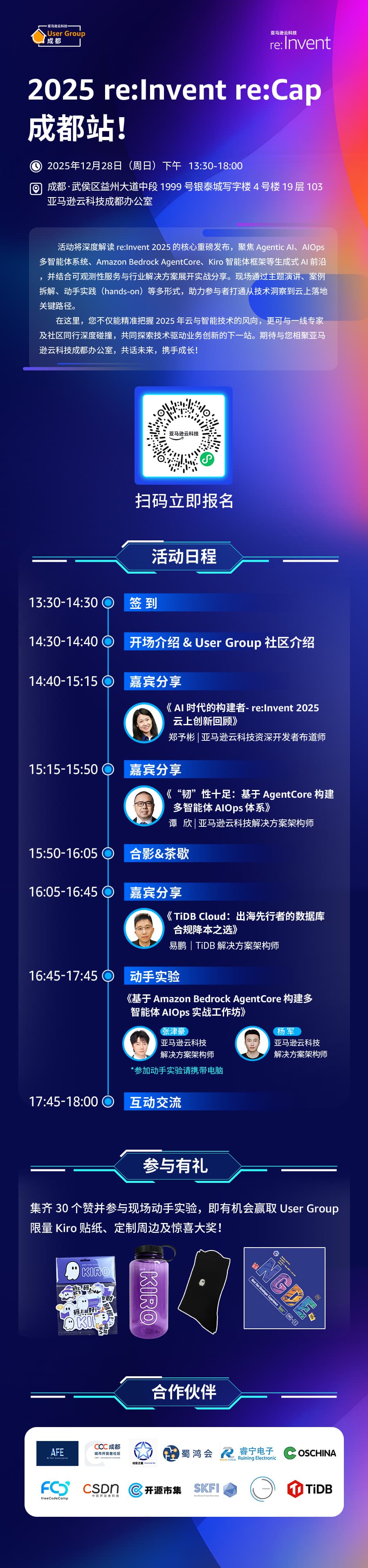 2025 re:Invent re:Cap 成都站来啦!活动将深度解读 re:Invent 2025 的核心重磅发布,聚焦 Agentic AI、AIOps 多智能体系统、Amazon Bedrock AgentCore、Kiro 智能体框架等生成式 AI 前沿,并结合可观测性服务与行业解决方案展开实战分享。现场通过主题演讲、案例拆解、动手实践(Hands-on)等多形式,助力参与者打通从技术洞察到云上落地关键路径。
