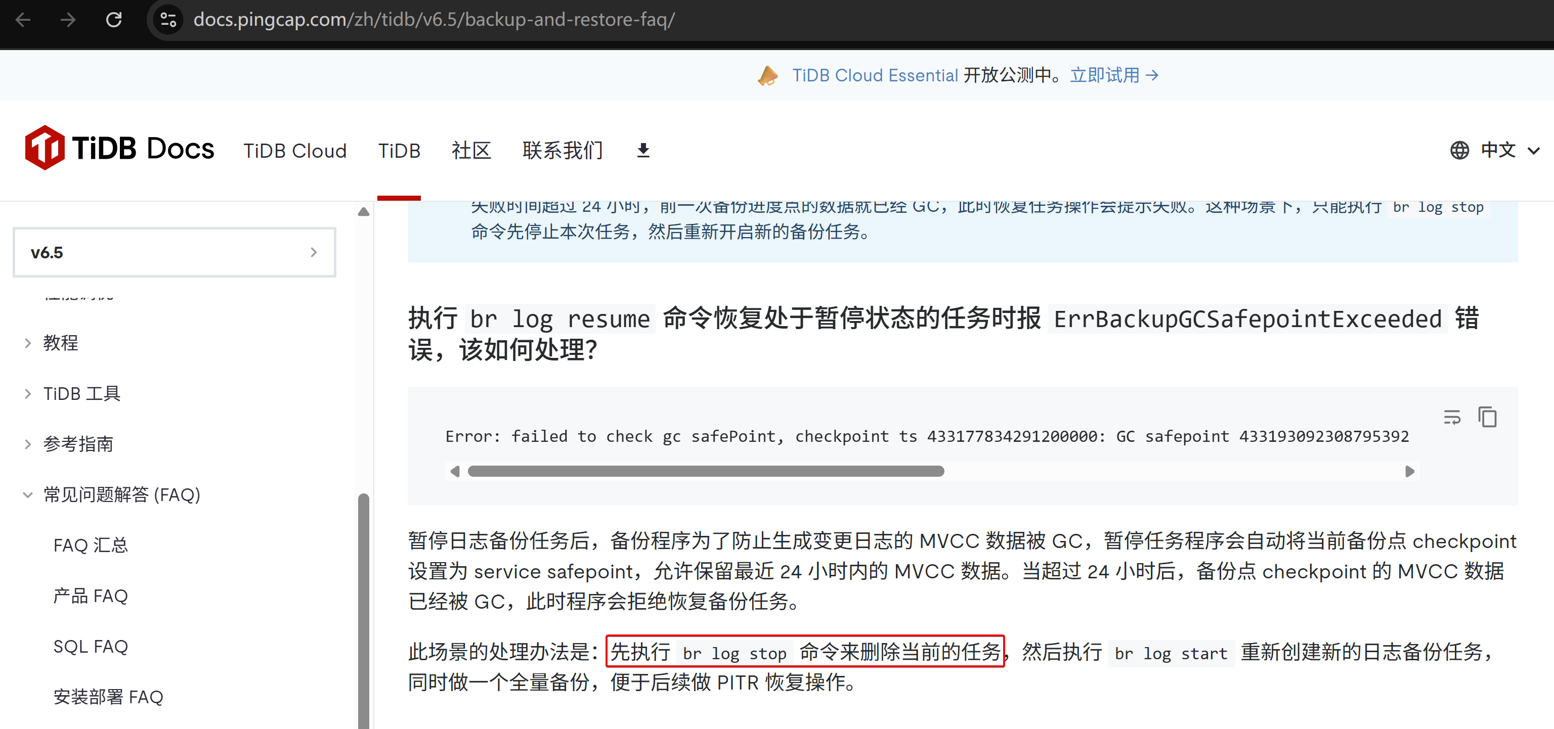 https://docs.pingcap.com/zh/tidb/v6.5/backup-and-restore-faq/