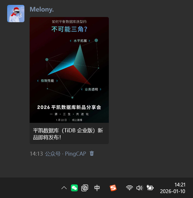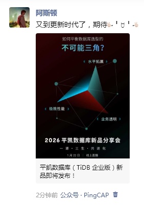 平凯数据库(TiDB 企业版)新品已发布!1 月 22 日直播预约开启,转发海报抽 TiDB 限量版极客风双肩背包!