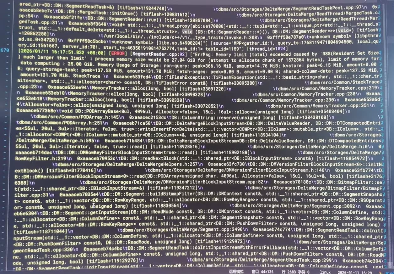 提交问题前我看到了这个文章,他是两个节点,他的方法就是加大tiflash内存分配,我从20G加到40G也报一样的错,我的x86服务器一样的程序和配置不报错,只有arm的环境必现