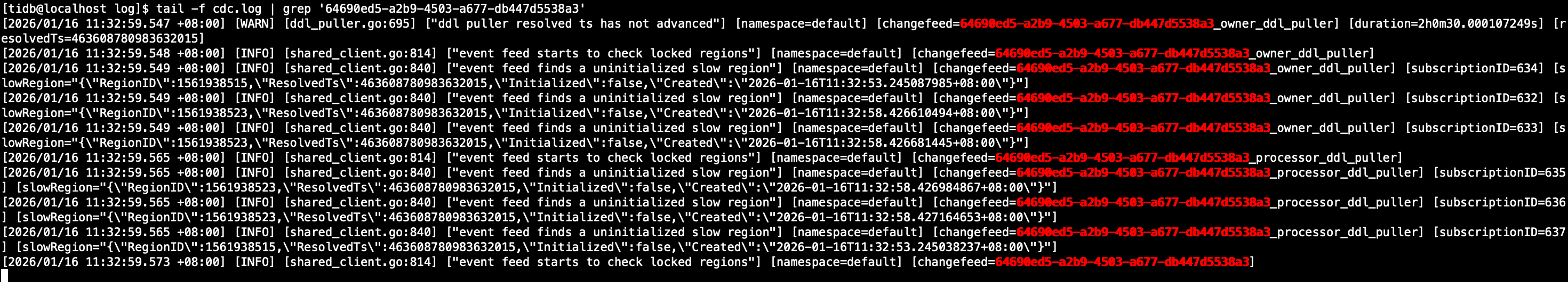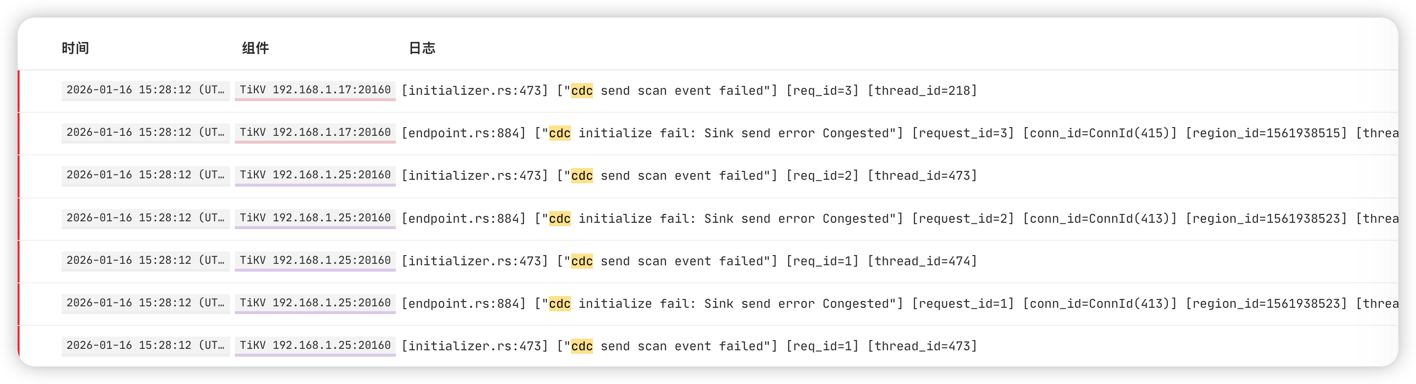 [2026/01/16 16:49:40.624 +08:00] [ERROR] [endpoint.rs:884] ["cdc initialize fail: Sink send error Congested"] [request_id=42] [conn_id=ConnId(91)] [region_id=1561938515] [thread_id=346]