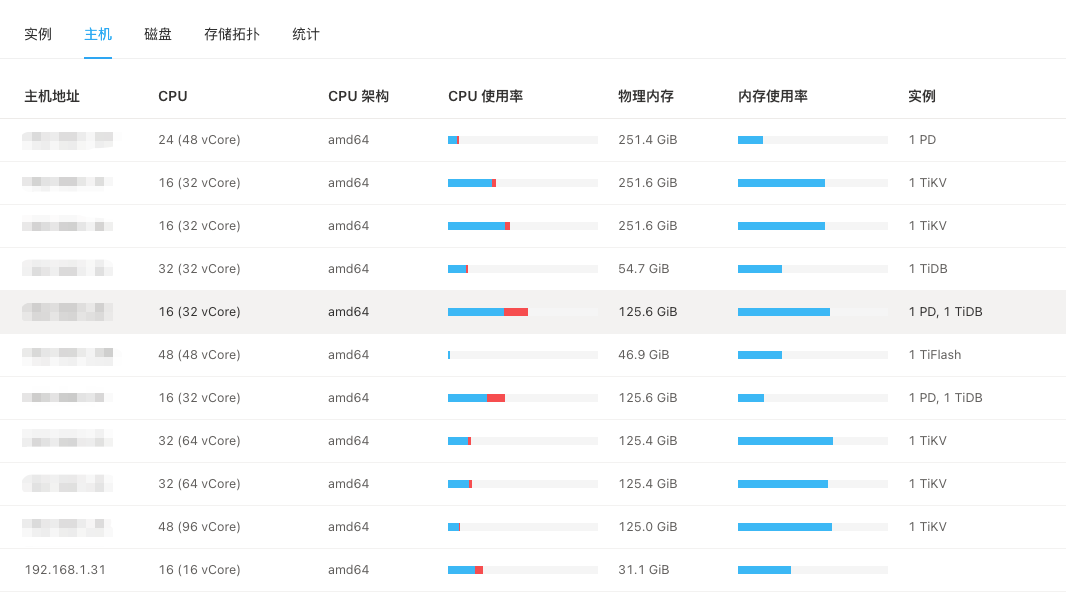 【资源配置】进入到 TiDB Dashboard -集群信息 (Cluster Info) -主机(Hosts) 截图此页面