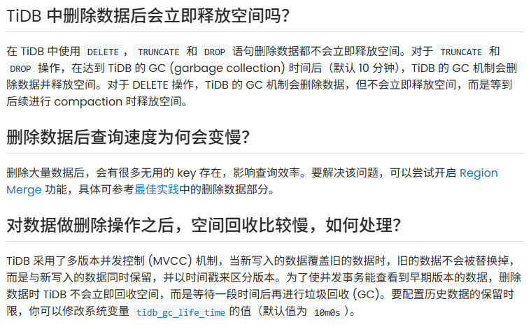 TiDB 清理数据后空间不减少,本质是其延迟回收的存储机制 导致的,核心原因可以拆解为 GC(垃圾回收)未正常推进 和 TiKV Compaction(文件合并)未及时回收空间 两大阶段问题