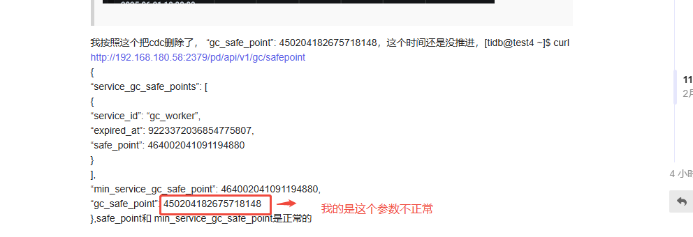 我按照这个把cdc删除了, “gc_safe_point”: 450204182675718148,这个时间还是没推进,[tidb@test4 ~]$ curl http://192.168.180.58:2379/pd/api/v1/gc/safepoint