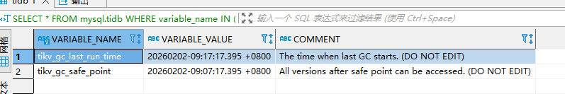 数据库表大表清理后,占用的空间不减少,通过SELECT * FROM mysql.tidb WHERE variable_name IN (‘tikv_gc_safe_point’, ‘tikv_gc_last_run_time’);查询结果正常,如下图: