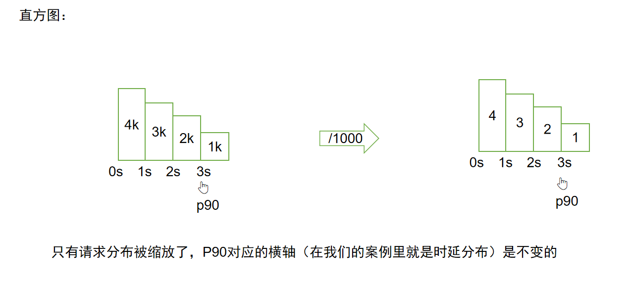 起初以为这个 / 1000是毫秒到秒的转换,后来实际上手查询后发现并非如此:原始的tikv_scheduler_command_duration_seconds_bucket的le单位就是秒。经过询问AI,最后确定这个/1000的作用是直方图缩放(见下图),理论上不会实质性影响Pxx的结果。
