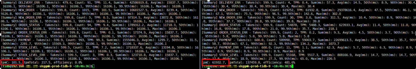 tiup bench tpcc -H 192.168.xxx.xx4,192.168.xxx.xx5,192.168.xxx.xx6 -P4000 -Uroot -p’XXXXXX’ -D tpcc --warehouses 1000 --threads 100 --time 10m run
