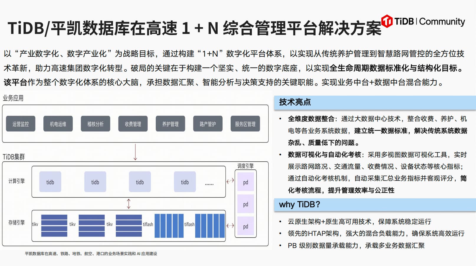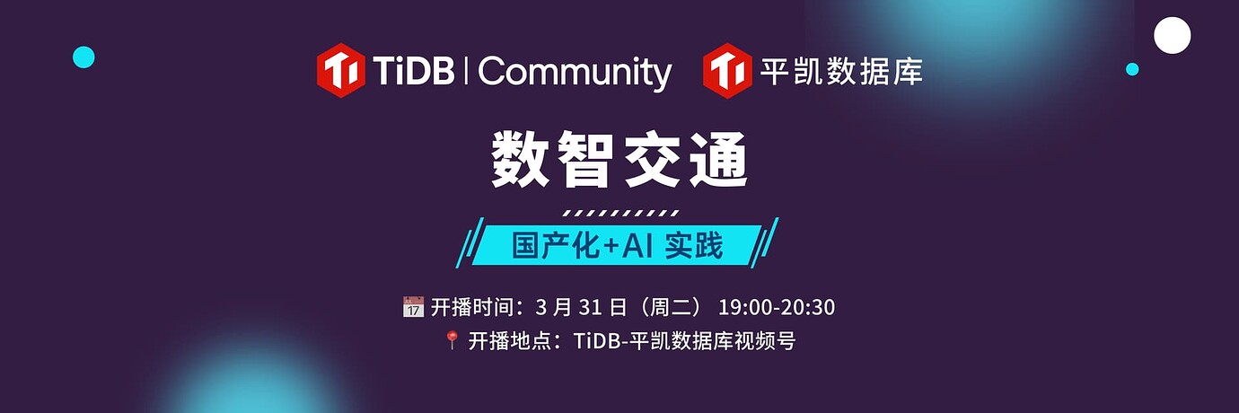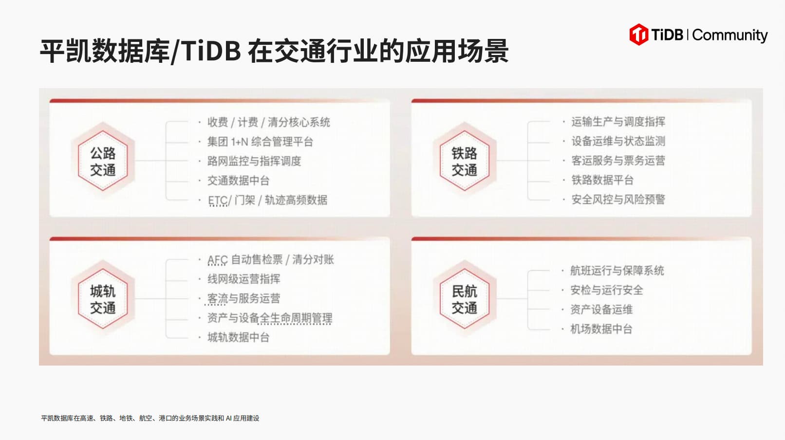 在 TiDB 社区的“数智交通:国产化 + AI 实践”线上 Meetup 中,两位资深行业专家与平凯数据库交通行业解决方案架构师齐聚云端,结合真实业务场景,深度剖析了交通行业数据底层基础设施的演进之路。