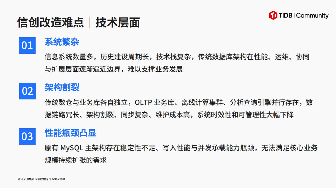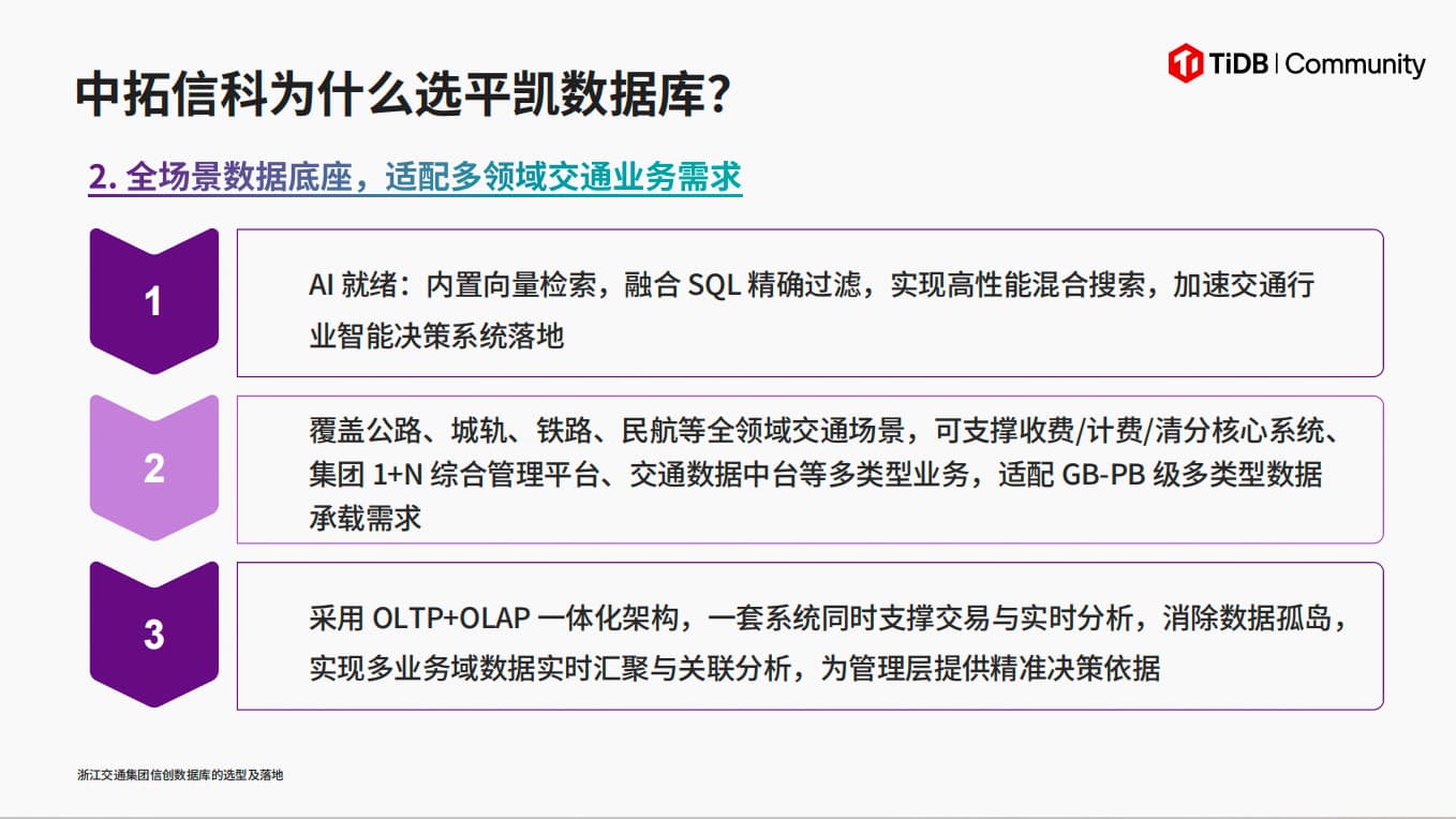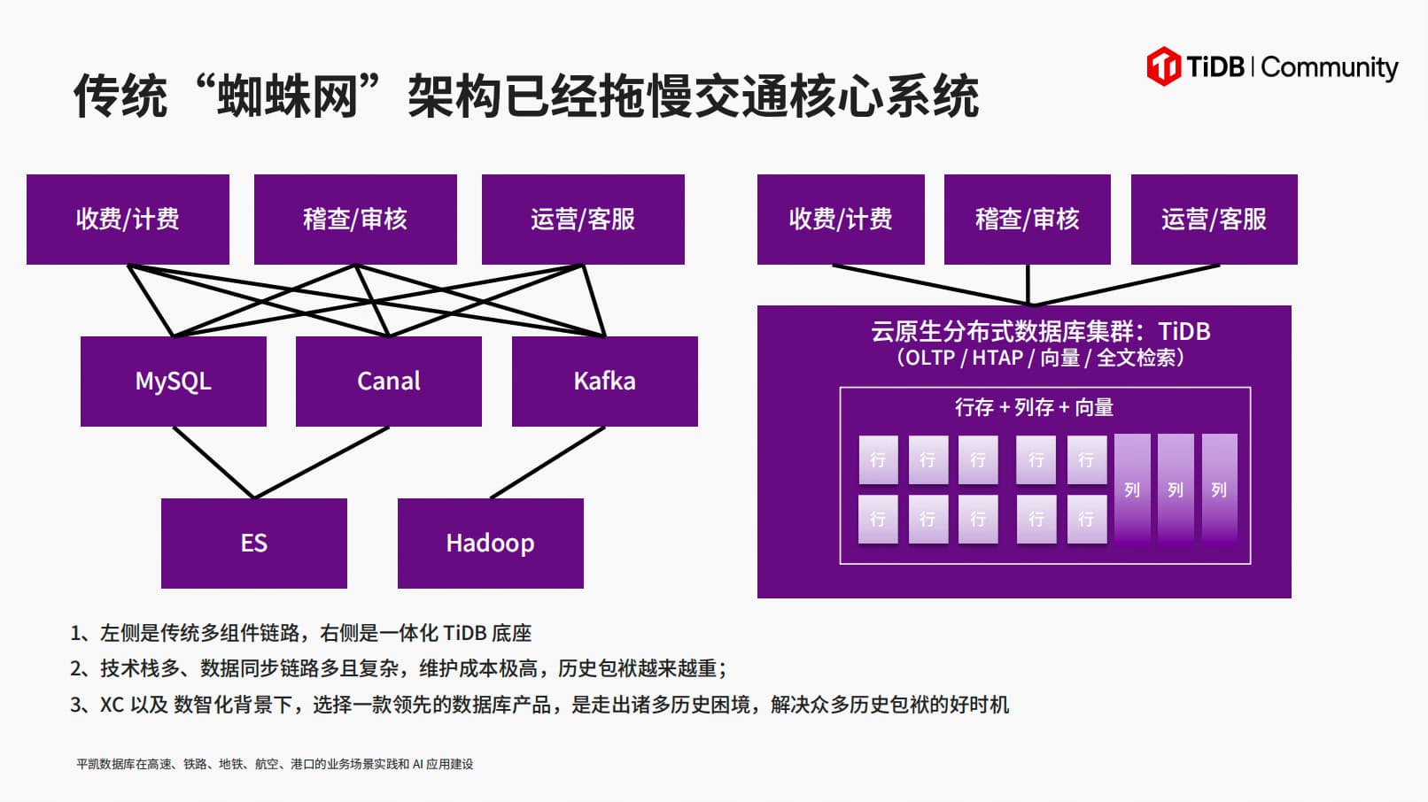 在 TiDB 社区的“数智交通:国产化 + AI 实践”线上 Meetup 中,两位资深行业专家与平凯数据库交通行业解决方案架构师齐聚云端,结合真实业务场景,深度剖析了交通行业数据底层基础设施的演进之路。