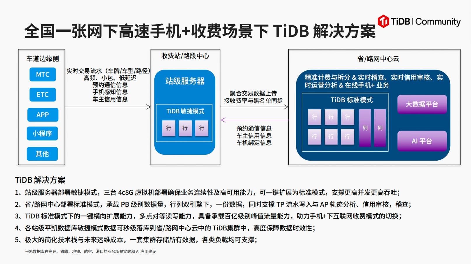 交通行业长期面临着海量数据持续增长、节假日高并发洪峰,以及传统“蜘蛛网”式数据库架构带来的数据孤岛与高昂运维成本等痛点。为破解这些难题,平凯数据库(TiDB 企业版)凭借云原生分布式 HTAP 架构,为交通行业构建了“一张网一套库”的统一数字底座。它具备存算分离、极致自适应弹性扩展和 PB 级数据承载能力,能够平滑应对极端峰值流量,并已广泛应用于高速公路、铁路、城轨及民航等核心业务场景。例如在全国高速“手机+”收费场景中,TiDB 通过站级“敏捷模式”与省级“标准模式”的协同部署,单套集群即可同时高效支撑海量高频交易流水写入与复杂的跨域信用稽核及运营分析。