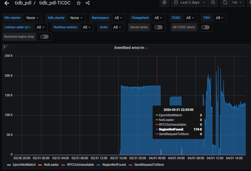 [2026/04/01 18:20:07.641 +08:00] [INFO] [shared_client.go:581] [“cdc region error”] [namespace=default] [changefeed=********payment-tidb-20260401] [subscriptionID=24] [error="region_not_found:<region_id:103872 > "]