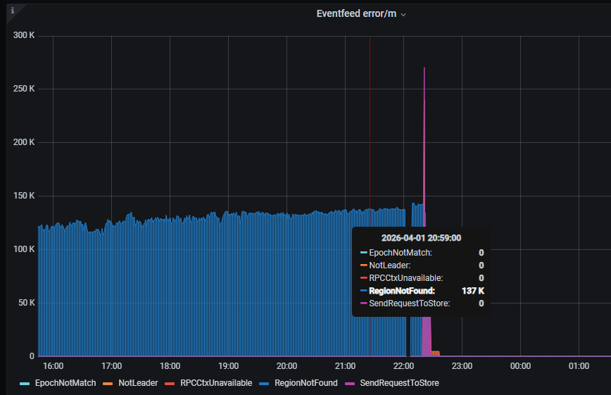 [2026/04/01 18:20:07.641 +08:00] [INFO] [shared_stream.go:483] [“event feed receives a region error”] [namespace=default] [changefeed=********payment-tidb-20260401] [streamID=22] [subscriptionID=24] [regionID=103872] [stateIsNil=false] [error="region_not_found:<region_id:103872 > "]