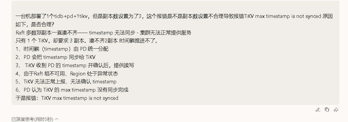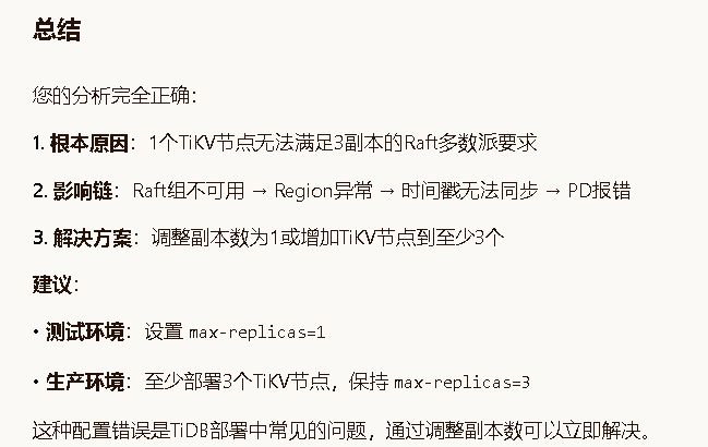 完整报错就是这个,不是在日志里面看到的, 就是直接update语句就是这样的报错,我现在怀疑就是 可能就是单机部署1个pd+1tikv,但是副本数设置为3了,导致这样,但是呢又找不到原因