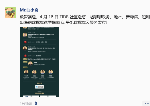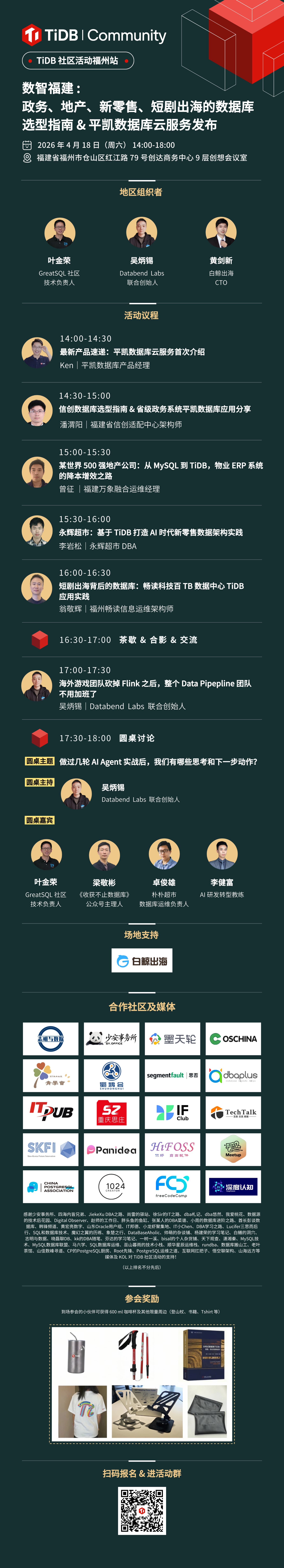 国产化和 AI 进展飞快的当下,我们应做些什么来满足需求和未雨绸缪?本期 TiDB 福州站我们邀请来自福建省信创适配中心、福建万象融合、永辉超市、畅读信息、Databend 的专家和技术负责人们跟我们分享数据库的应用和见解,还有当下大家最关心的龙虾实践圆桌讨论,平凯数据库云服务发布后的首次介绍!干货满满,诚邀福建的 TIDBer 一起来线下探讨!