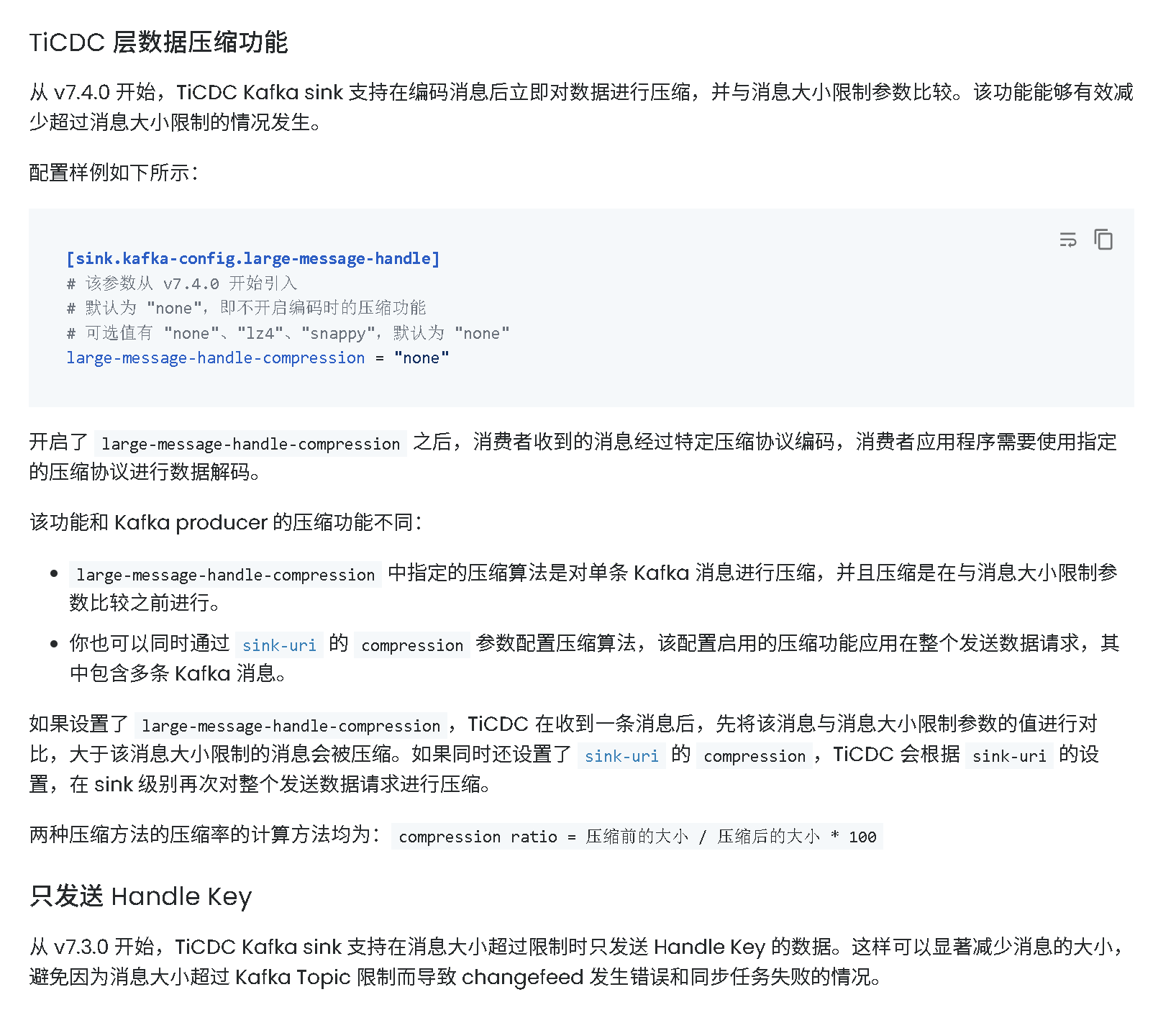 - 配套注意事项:压缩会增加 TiCDC / 下游 CPU 开销,需确认资源充足;优先用 zstd 平衡压缩比与性能,调整配置前先暂停对应 changefeed。