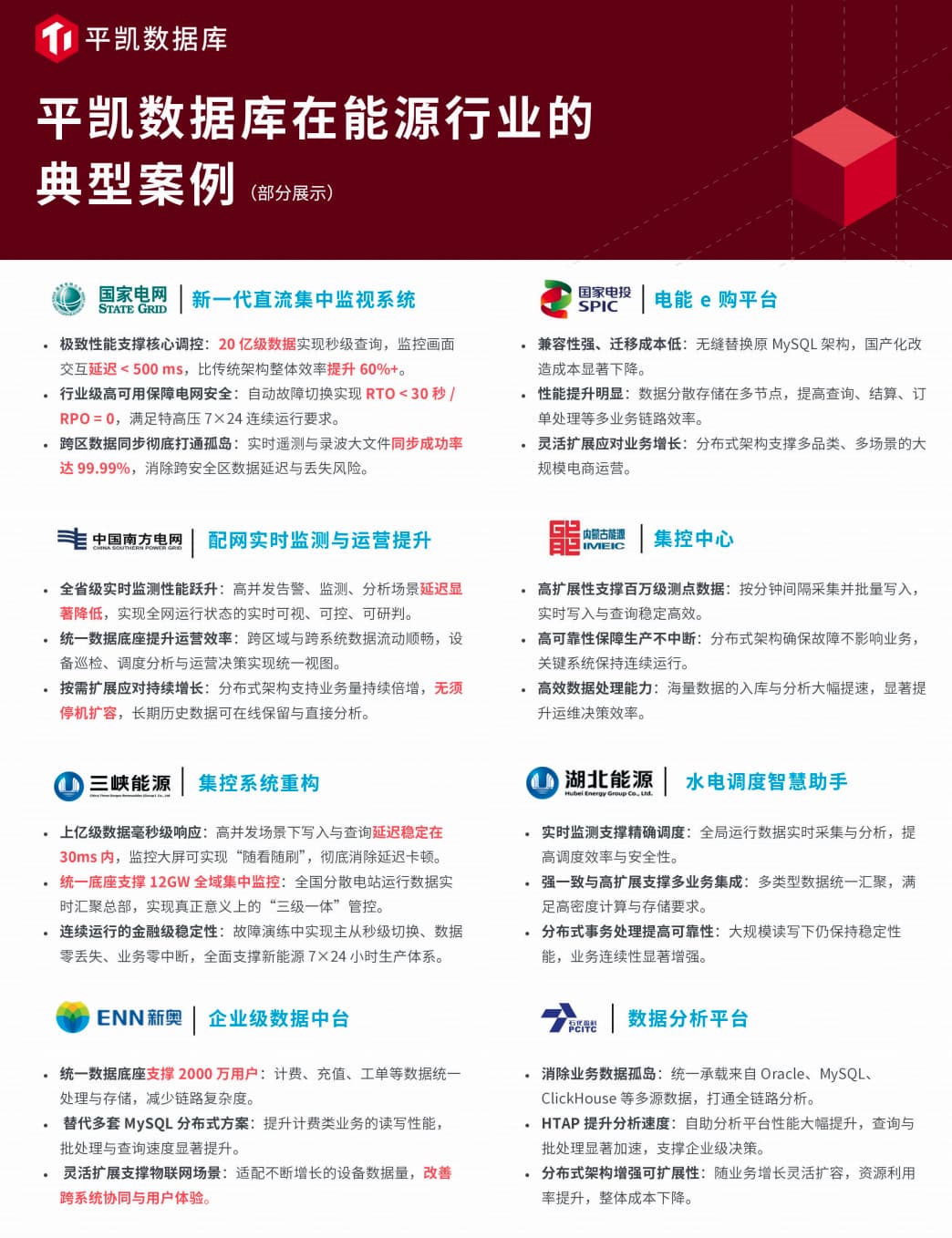 在能源行业数字化转型与国产化升级背景下,电力电网、新能源、油气石化、工矿能源等场景,普遍面临海量时序数据爆发、交易与分析分离、传统架构扩展受限、系统高可用要求严苛等痛点。平凯数据库(TiDB 企业版) 依托原生分布式架构与一体化 HTAP 能力,打造适配能源全场景的专属解决方案,以一套数据底座融合事务处理、实时分析、海量存储与弹性扩展能力,助力能源企业精简技术架构、降本增效,实现核心业务自主可控。