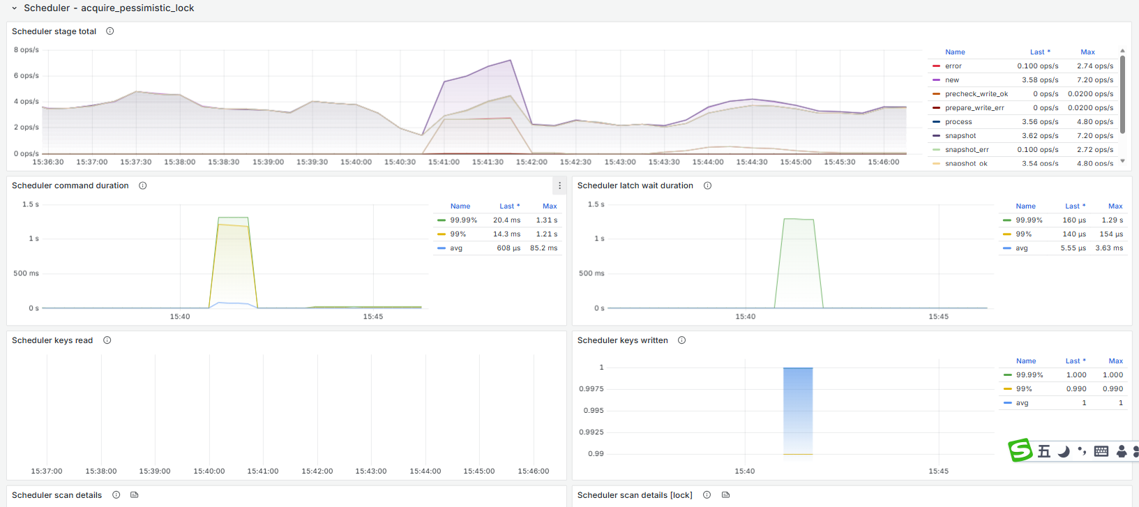 time:30.2s, loops:5, prepare: 53.7s, check_insert: {total_time: 30.1s, mem_insert_time: 436.4µs, prefetch: 30.1s, rpc:{BatchGet:{num_rpc:244, total_time:539ms}, rpc_errors:{stale_command:132, not_leader:103},regionScheduling_backoff:{num:36, total_time:14.5s},regionMiss_backoff:{num:24, total_time:8.51s}, time_detail: {total_kv_read_wall_time: 733.8µs, tikv_wall_time: 857.8µs}, scan_detail: {total_process_keys: 2, total_process_keys_size: 279, total_keys: 3, get_snapshot_time: 64.6µs, rocksdb: {block: {cache_hit_count: 29}}}}}, commit_txn: {prewrite:714.4µs, region_num:1, write_keys:1, write_byte:181, txn_retry:1}, lock_keys: {time:2.25ms, region:2, keys:2, slowest_rpc: {total: 0.002s, region_id: 1895, store: 10.0.1.229:20160, time_detail: {tikv_wall_time: 1.29ms}, scan_detail: {get_snapshot_time: 11.8µs, rocksdb: {block: {cache_hit_count: 9}}}, }, lock_rpc:2.210754ms, rpc_count:2}